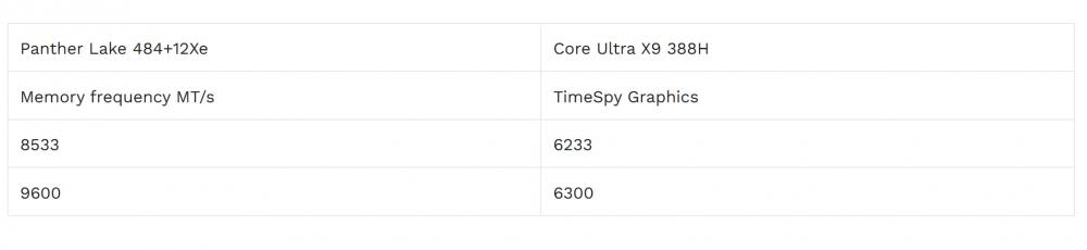 ข้อมูลที่โดดเด่นที่สุดมาจากผลทดสอบ 3DMark Time Spy ของรุ่นเรือธง Core Ultra X9 388H ซึ่งทำคะแนนได้ประมาณ 6,233 คะแนน เมื่อใช้หน่วยความจำ 8533 MT/s และเพิ่มขึ้นเป็นราว 6,300 คะแนน เมื่อใช้หน่วยความจำ LPDDR5X 9600 MT/s ที่เร็วกว่า