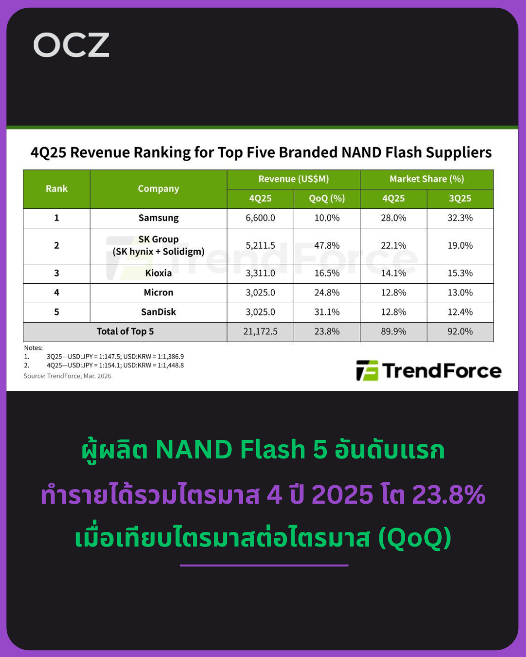 อุตสาหกรรม NAND Flash ทั่วโลกยังคงได้รับอานิสงส์จากการลงทุนโครงสร้างพื้นฐานด้าน AI อย่างต่อเนื่องในไตรมาส 4 ปี 2025 (4Q25) ตามรายงานล่าสุดของ TrendForce โดยรายได้รวมของผู้ผลิต NAND Flash 5 อันดับแรก เพิ่มขึ้นอย่างมาก 23.8% เมื่อเทียบไตรมาสต่อไตรมาส (QoQ) แตะระดับ 21.17 พันล้านดอลลาร์สหรัฐ
