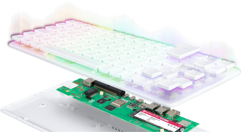 Raspberry Pi 500+ มาพร้อมคีย์บอร์ดแมคคานิคคุณภาพสูง สามารถถอดปุ่มได้ มีไฟ RGB ที่ตั้งค่าแยกแต่ละปุ่มได้, สล็อต M.2 ภายใน พร้อม SSD ของ Raspberry Pi ความจุ 256 GB ติดตั้งมาให้ และ RAM 16 GB