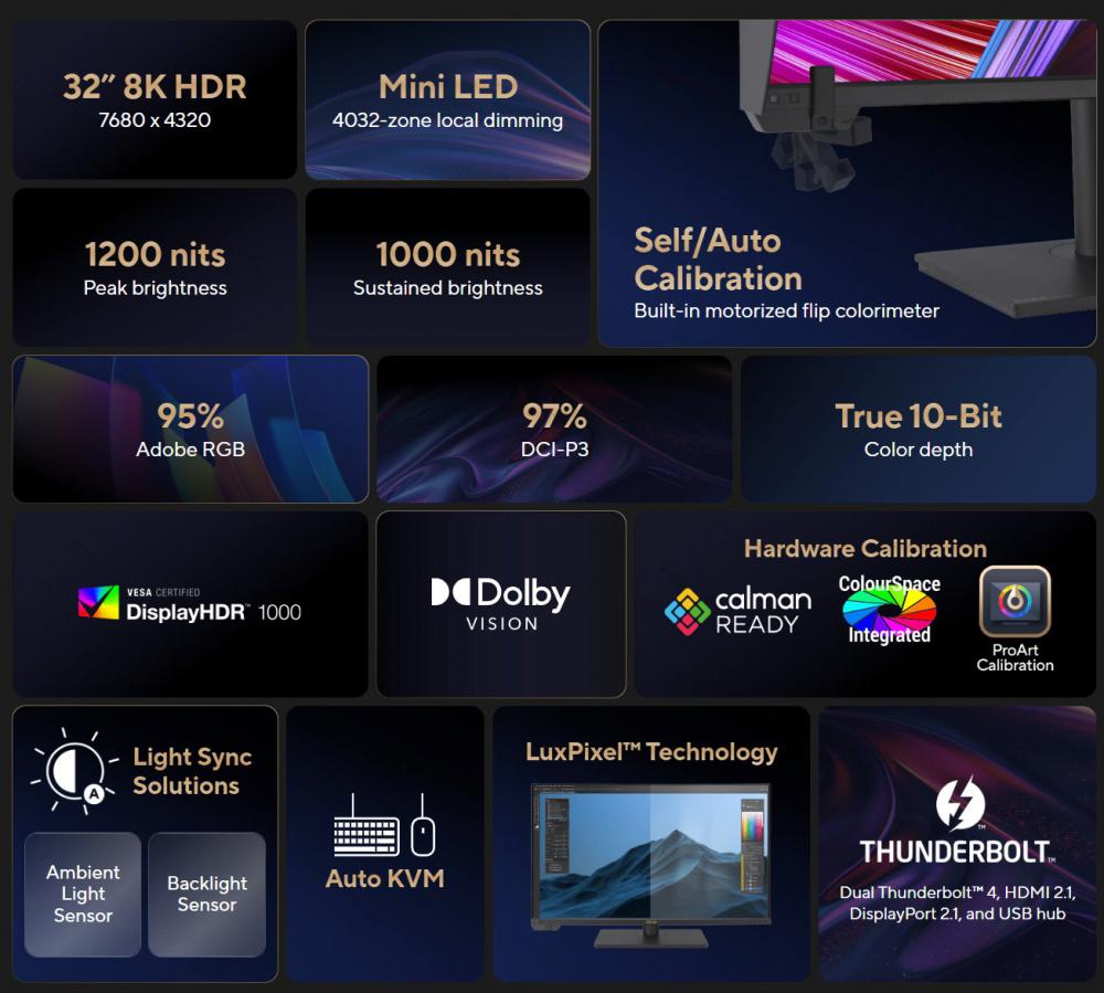 จอขนาด 32 นิ้ว ตัวนี้ถูกออกแบบมาเพื่อผู้สร้างสรรค์คอนเทนต์ที่ต้องการ ความเที่ยงตรงของสีและความคมชัดของภาพในระดับสูงสุด โดยมาพร้อมความละเอียด 7680×4320 พิกเซล, ระบบ Local Dimming 4032 โซน, และความสว่างสูงสุด 1200 นิต