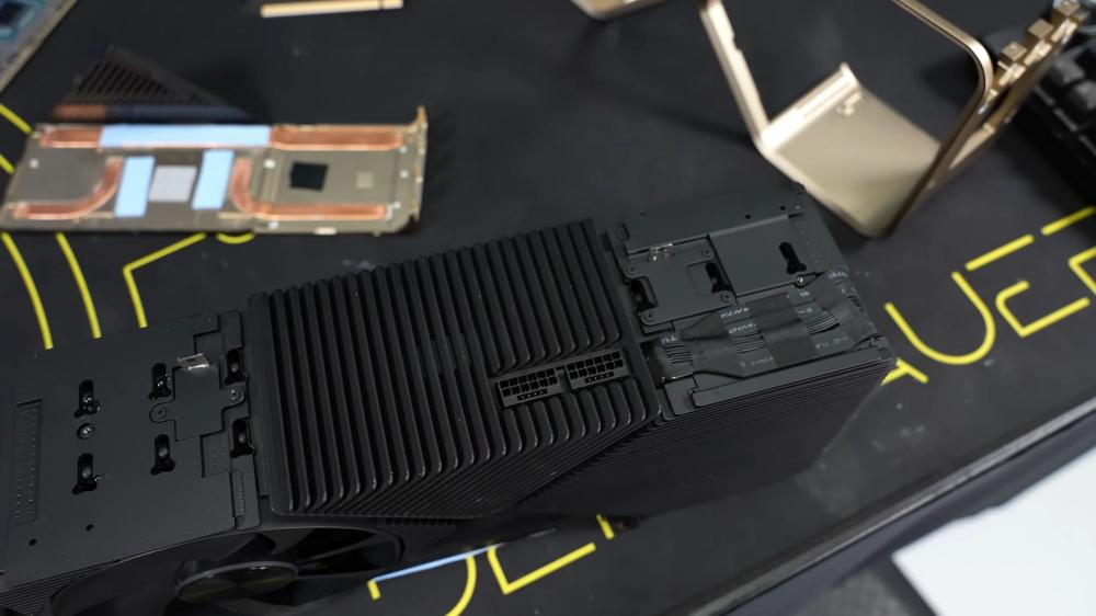 ระบบจ่ายไฟก็แปลกไม่แพ้กัน โดยไม่ได้ใช้คอนเนกเตอร์ไฟแบบติดบน PCB โดยตรง แต่ใช้ แผ่นสัมผัสและตัวนำทองแดงแบบแข็ง ที่ฝังอยู่ในชุดฮีตซิงก์ เพื่อป้อนพลังงานเข้าสู่หัว 12VHPWR คู่ แทน หลังประกอบกลับ Roman ก็ยืนยันว่าการ์ดยังสามารถแสดงผลได้ตามปกติ