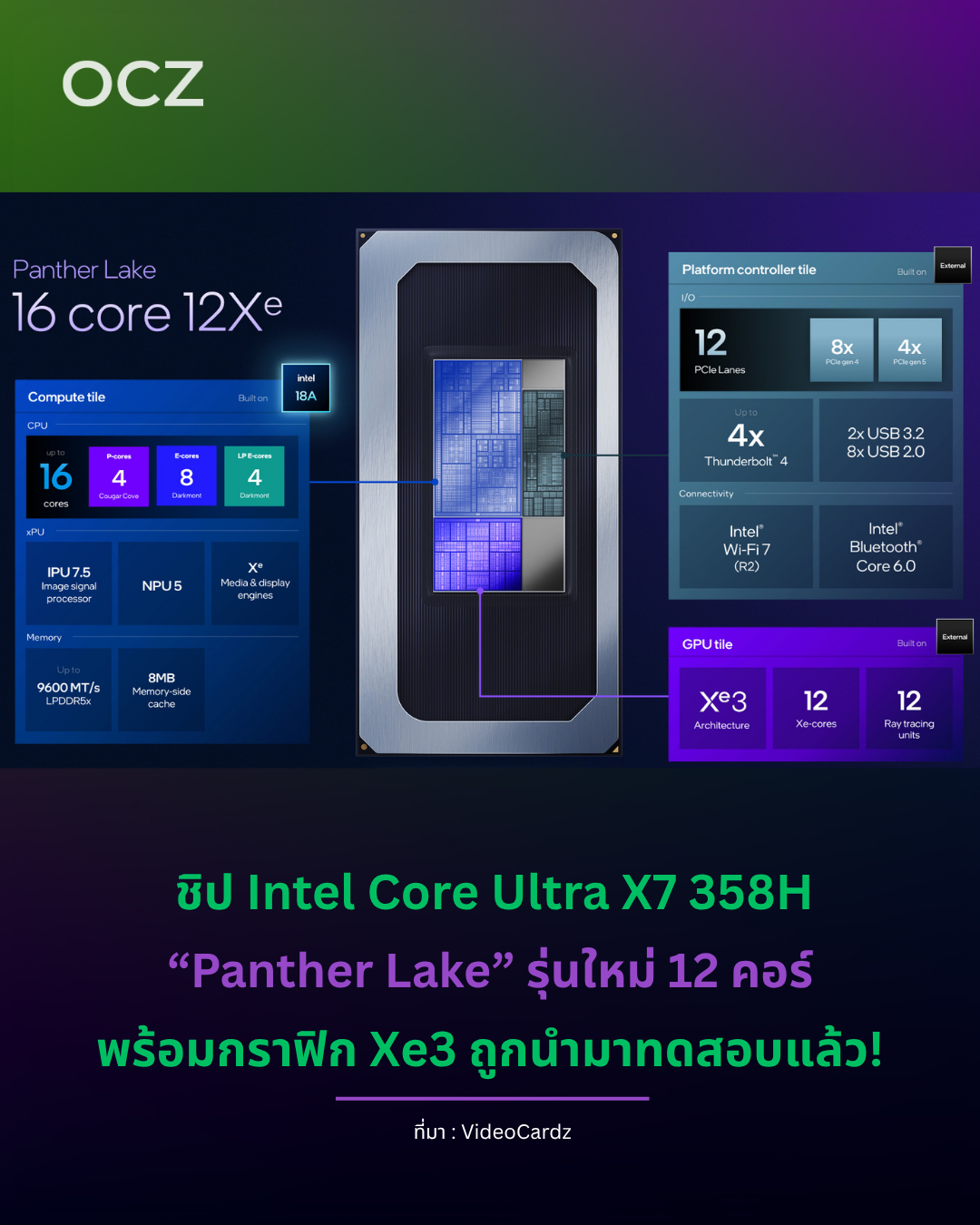 ซีพียู Intel Core Ultra X7 358H รุ่นใหม่ล่าสุดถูกพบในฐานข้อมูลของ Geekbench ซึ่งถือเป็นครั้งแรกที่ซีรีส์ Panther Lake ปรากฏตัวพร้อมกับ กราฟิก Xe3 แบบรวม (integrated) เต็มรูปแบบ โดยชิปตัวนี้มาพร้อมระบบหน่วยความจำที่เร็วที่สุดในตระกูล Panther Lake — ความเร็วสูงถึง 9,600 MT/s