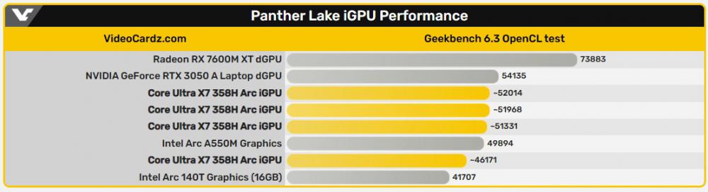 อย่างไรก็ตาม คะแนนจาก Geekbench มักไม่สะท้อนประสิทธิภาพจริงของกราฟิก Intel ได้เต็มที่ เนื่องจาก AMD และ NVIDIA มักทำคะแนนได้ดีกว่าในชุดทดสอบ OpenCL เดียวกัน เมื่อเทียบกับรุ่นก่อนอย่าง Arrow Lake-H (Arc 140T iGPU) พบว่า Xe3 รุ่นใหม่นี้มีประสิทธิภาพเพิ่มขึ้นราว 25%