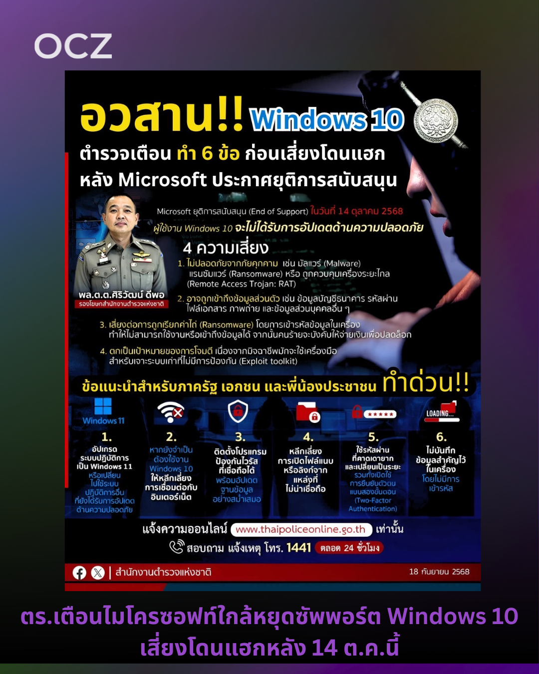 ตำรวจไทยและหน่วยงานด้านความปลอดภัยไซเบอร์ออกประกาศเตือนประชาชนและองค์กรต่าง ๆ ที่ยังใช้งาน ระบบปฏิบัติการ Windows 10 ให้รีบเตรียมการอัปเกรดหรือเปลี่ยนไปใช้เวอร์ชันที่ใหม่กว่า หลังวันที่ 14 ตุลาคม 2568 เป็นต้นไป ไมโครซอฟท์จะ ยุติการสนับสนุนอย่างเป็นทางการ (End of Support) ทำให้ผู้ใช้งานไม่ได้รับการอัปเดตด้านความปลอดภัยอีกต่อไป และเสี่ยงถูกโจมตีจากแฮกเกอร์มากขึ้นอย่างมีนัยสำคัญ