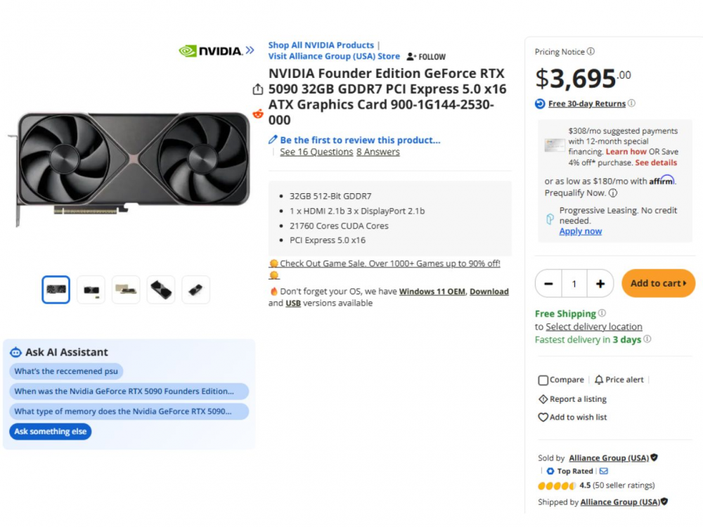 การ์ด RTX 5090 FE ซึ่งมีราคาแนะนำ (MSRP) ที่ 1,999 ดอลลาร์สหรัฐ บนเว็บไซต์ Newegg ถูกปรับราคาขึ้นไปถึง 3,695 ดอลลาร์ แล้ว ขณะที่การ์ดจากพาร์ตเนอร์ (AIC) รุ่นเรือธงบางรุ่นมีราคาสูงสุดแตะระดับ 5,000 ดอลลาร์สหรัฐ