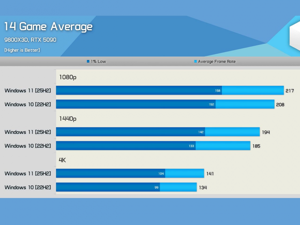 ล่าสุด Hardware Unboxed ได้ทดสอบเปรียบเทียบ Windows 10 22H2 กับ Windows 11 25H2 โดยอ้างอิงผลการเล่นเกม AAA จำนวน 14 เกม และพบว่า Windows 11 25H2 ทำผลงานด้านเกมได้เหนือกว่า Windows 10 22H2 อย่างชัดเจน
