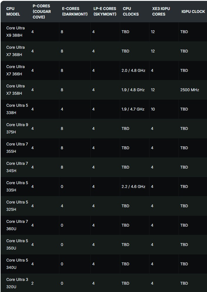 ซีพียู Intel Panther Lake “Core Ultra Series 3” ที่หลุดออกมารอบนี้มีทั้งหมด 4 รุ่น ได้แก่