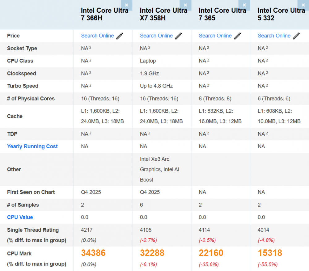 มีข้อมูลหลุดของซีพียู Intel Panther Lake “Core Ultra Series 3” หลายรุ่น พร้อมผลทดสอบจาก PassMark Software เผยให้เห็นสเปกและประสิทธิภาพเบื้องต้น
