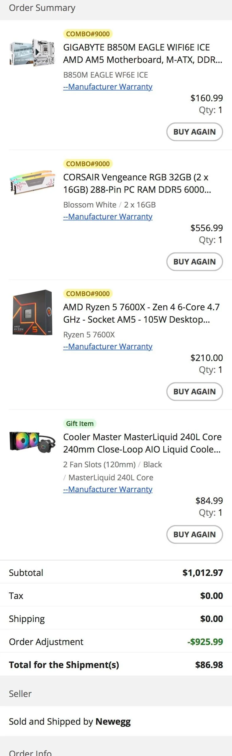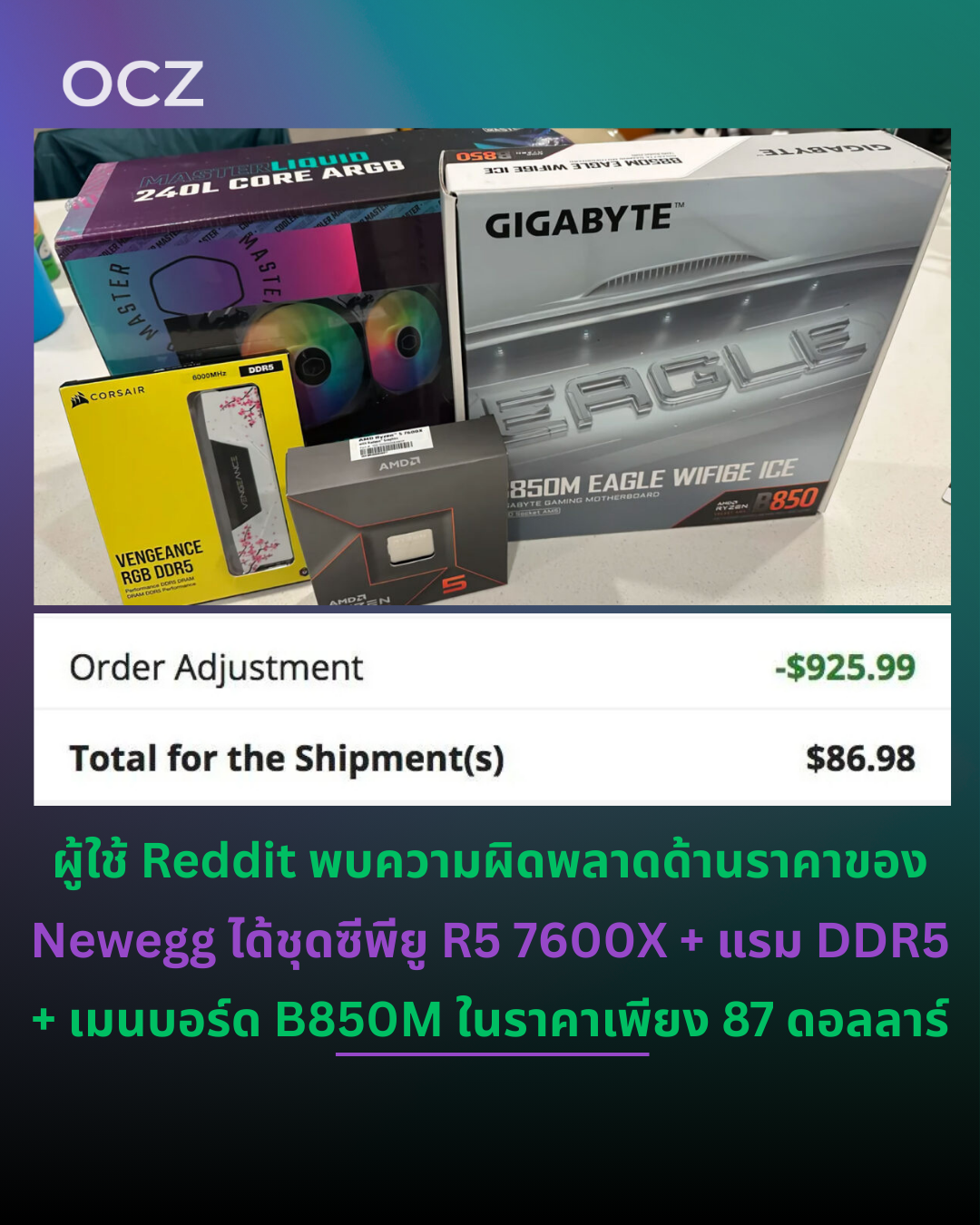 ผู้ใช้ Reddit รายหนึ่งระบุว่า Newegg ได้จัดส่ง ชุดเริ่มต้นแพลตฟอร์ม AM5 ทั้งชุด ให้เขาในราคาเพียง 86.98 ดอลลาร์ หลังจากเกิดความผิดพลาดในระบบ Combo Configurator ที่ทำให้ชุดแรม Corsair DDR5 ได้รับส่วนลดรวมเกือบ 800 ดอลลาร์