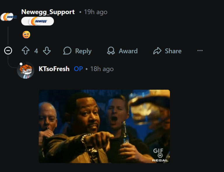 ที่น่าสนใจคือ บัญชีของ Newegg เองก็เข้ามาคอมเมนต์ในเธรด พร้อมอีโมจิยิ้ม
