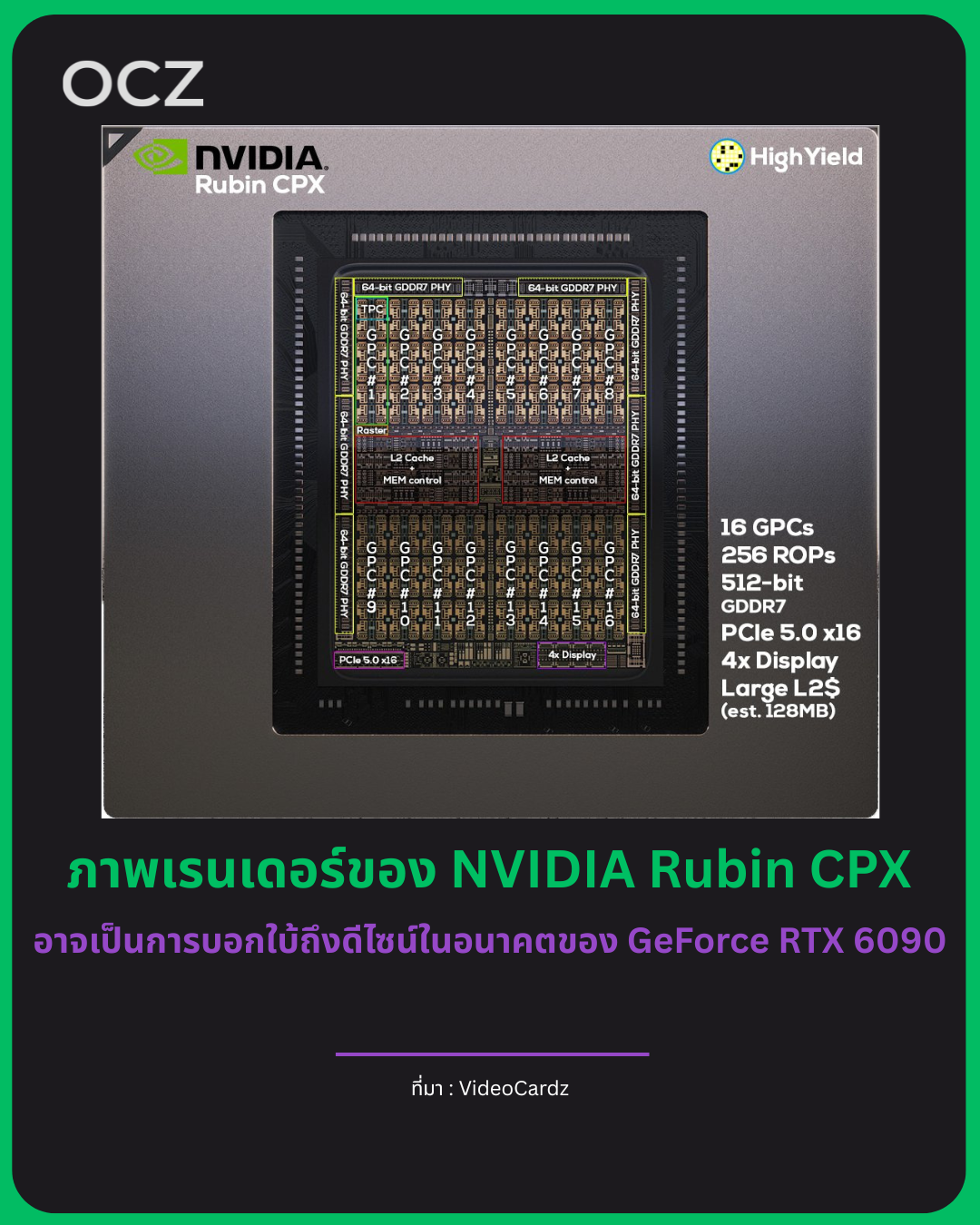 YouTuber “High Yield” ซึ่งเชี่ยวชาญด้านการวิเคราะห์ die shot พบว่า Rubin CPX ดูเหมือนจะมีทั้ง raster units, display engines และ ROPs ครบชุด — ซึ่งทั้งหมดนี้ไม่จำเป็นต่อการประมวลผล AI เพียว ๆ แต่กลับเป็นหัวใจหลักของงานกราฟิกแบบดั้งเดิม จึงมีความเป็นไปได้ว่า Rubin CPX อาจถูกนำมาใช้เป็นฐานของ GeForce RTX 6090 รุ่นถัดไป