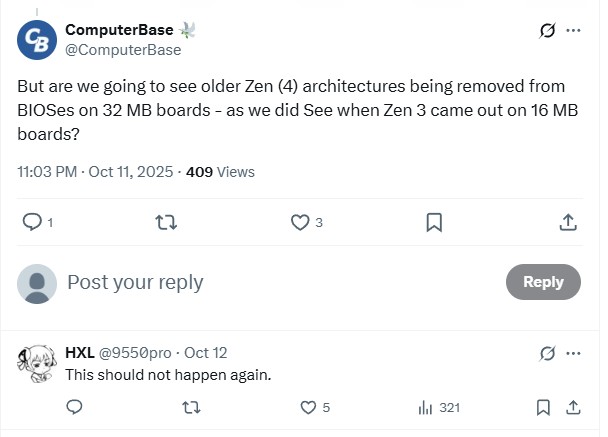 สถานการณ์ลักษณะนี้เคยเกิดขึ้นมาแล้วในยุคของ Zen 4 — เมนบอร์ดรุ่นแรก ๆ ใช้ BIOS ขนาด 16 MB ก่อนจะถูกอัปเกรดเป็น 32 MB ในภายหลัง ซึ่งข้อจำกัดนั้นทำให้ผู้ผลิตหลายรายต้อง ตัดการรองรับซีพียู AM4 รุ่นเก่า ออกไปบางส่วน เนื่องจาก AMD ยังคงขยายไลน์อัปอย่างต่อเนื่องจนเข้าสู่ปีที่ 9 แล้ว