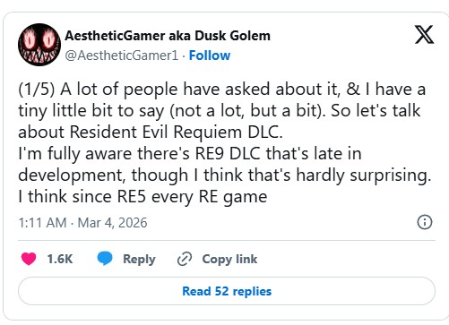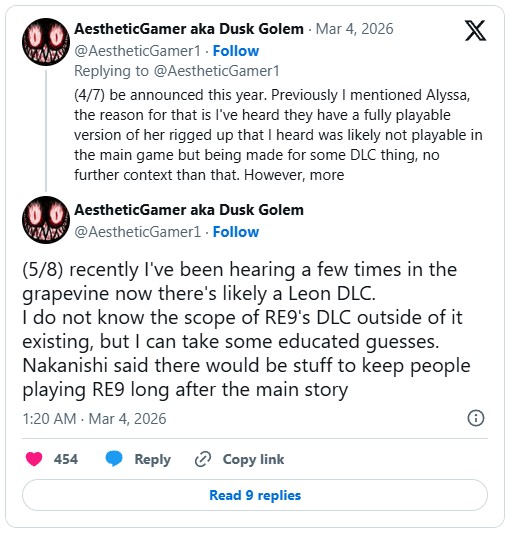 ข้อมูลนี้มาจาก Dusk Golem ซึ่งถือเป็นหนึ่งในแหล่งข่าวหลุด Resident Evil ที่มีความน่าเชื่อถือพอสมควร โดยเจ้าตัวได้โพสต์เธรดยาวบน X (Twitter เดิม) เปิดเผยทั้งรายละเอียด DLC และทิศทางของซีรีส์ในอนาคต