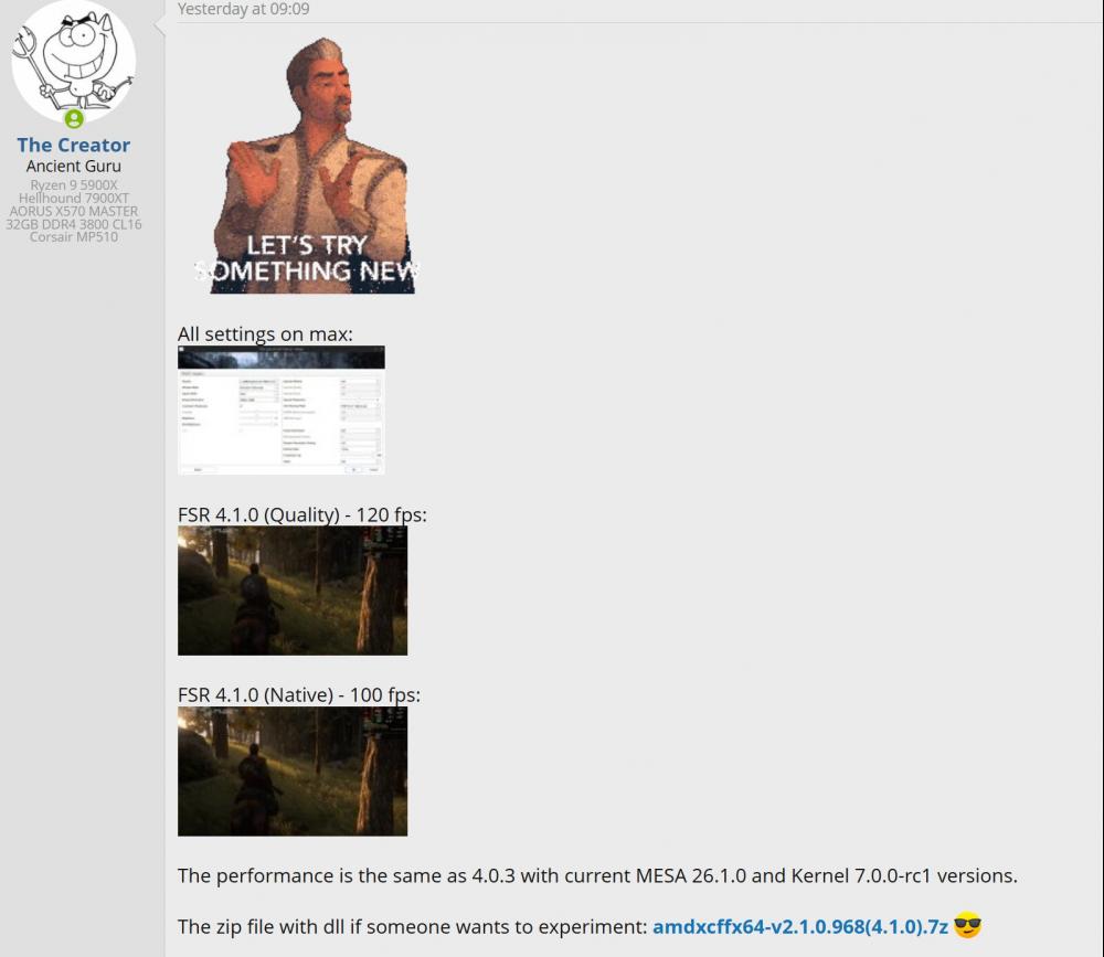 มีผู้ใช้ Reddit รายหนึ่งนำไฟล์นี้ไปทดสอบกับ Radeon RX 7900 XTX ซึ่งเป็นการ์ดจอ RDNA 3 ที่ตามปกติไม่ได้รองรับ FSR 4 อย่างเป็นทางการ แต่ก็ถูกนำมาทดลองใช้งานบิลด์อัปสเกลที่ยังไม่เปิดตัวแล้ว
