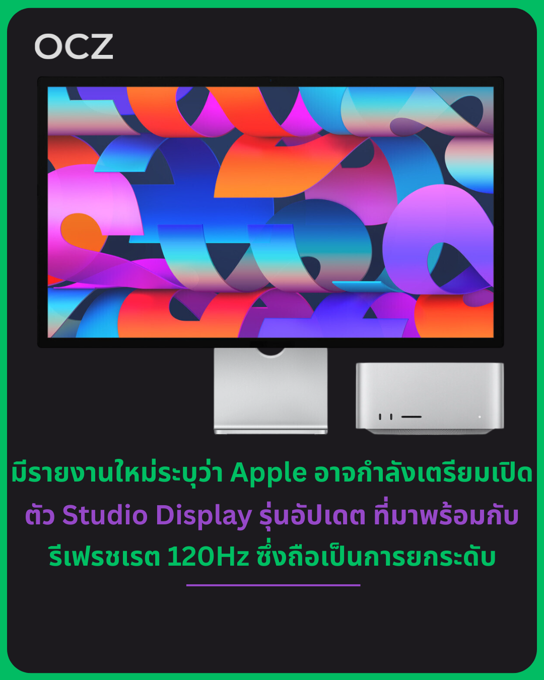ข้อมูลหลุดระบุว่า Studio Display รุ่นที่สองจะอัปเกรดรีเฟรชเรตจาก 60Hz เป็น 120Hz ProMotion พร้อมรองรับอัตรารีเฟรชแบบแปรผัน (Variable Refresh Rate) นอกจากนี้ยังมีโหมด HDR และ SDR ซึ่งชี้ว่าพาเนลน่าจะได้รับการอัปเดตครั้งใหญ่—มีโอกาสสูงว่าจะเป็น Mini-LED ส่วน OLED ยังดูเป็นไปได้ยากกว่า เนื่องจากทิศทางของ Apple และข่าวลือก่อนหน้าเคยระบุว่า Mini-LED Studio Display ถูกวางแผนไว้สำหรับปี 2025