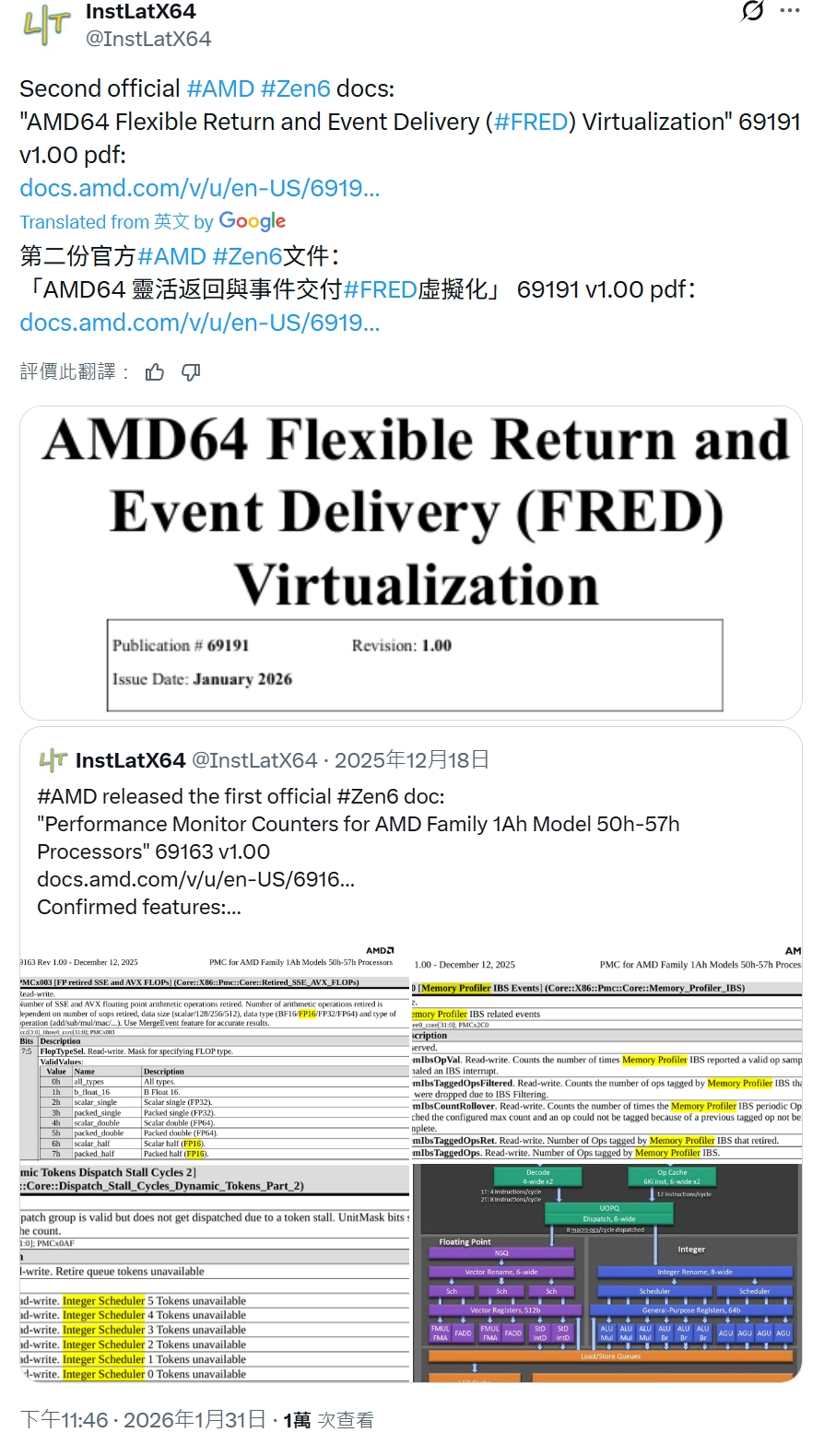 ผู้ใช้แพลตฟอร์ม X ชื่อ InstLatX64 ค้นพบจากเอกสารทางการของ AMD เมื่อสัปดาห์ที่แล้ว (31 มกราคม) ว่าโปรเซสเซอร์สถาปัตยกรรม Zen 6 จะนำเทคโนโลยีชุดคำสั่ง Intel FRED มาใช้งาน ซึ่งคาดว่าจะเป็นการยุติมาตรฐาน IDT ที่มีมาตั้งแต่ยุคทศวรรษ 1980 พร้อมทั้งเพิ่มชุดคำสั่งใหม่สำหรับ การคูณเมทริกซ์ และ การกลับค่าบิต (bit inversion)