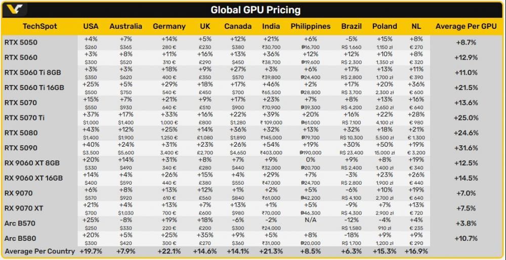จึงพยายามแก้ปัญหานี้ด้วยการนำราคาการ์ดจอรุ่นปัจจุบัน 14 รุ่น มาเปรียบเทียบกันใน 10 ภูมิภาค โดยใช้ข้อมูลราคาช่วงเดือนพฤศจิกายน 2025 เทียบกับข้อมูลอัปเดตในเดือนกุมภาพันธ์ 2026