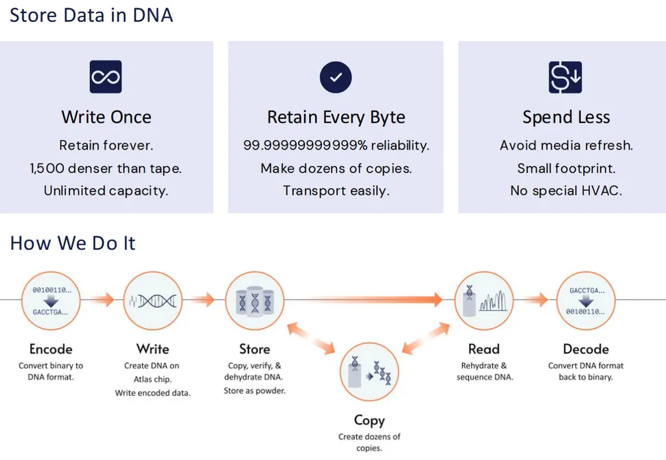 บริษัทอ้างว่าระบบนี้ใช้ DNA สังเคราะห์จาก Twist Bioscience ซึ่งเคยร่วมงานกับ Microsoft ในโครงการจัดเก็บข้อมูลด้วย DNA มาก่อน