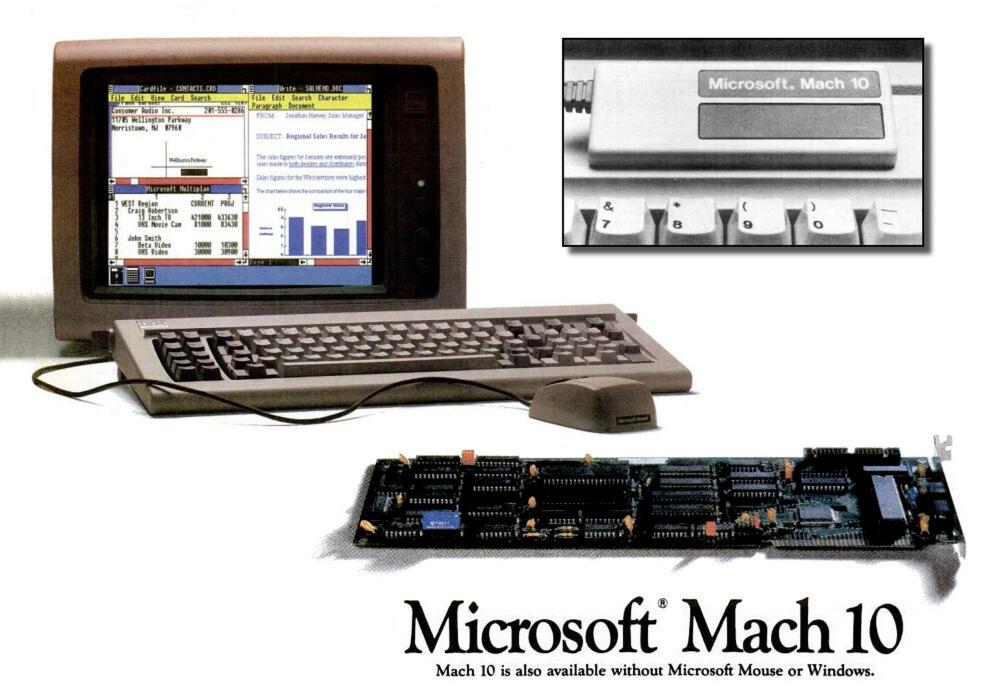 Microsoft เองก็เข้าร่วมตลาดนี้ด้วย Mach 10 — การ์ดที่เสียบเข้ากับซ็อกเก็ต CPU เดิมในเครื่อง และใช้ซีพียู 8086 บนการ์ดแทนตัวเดิม