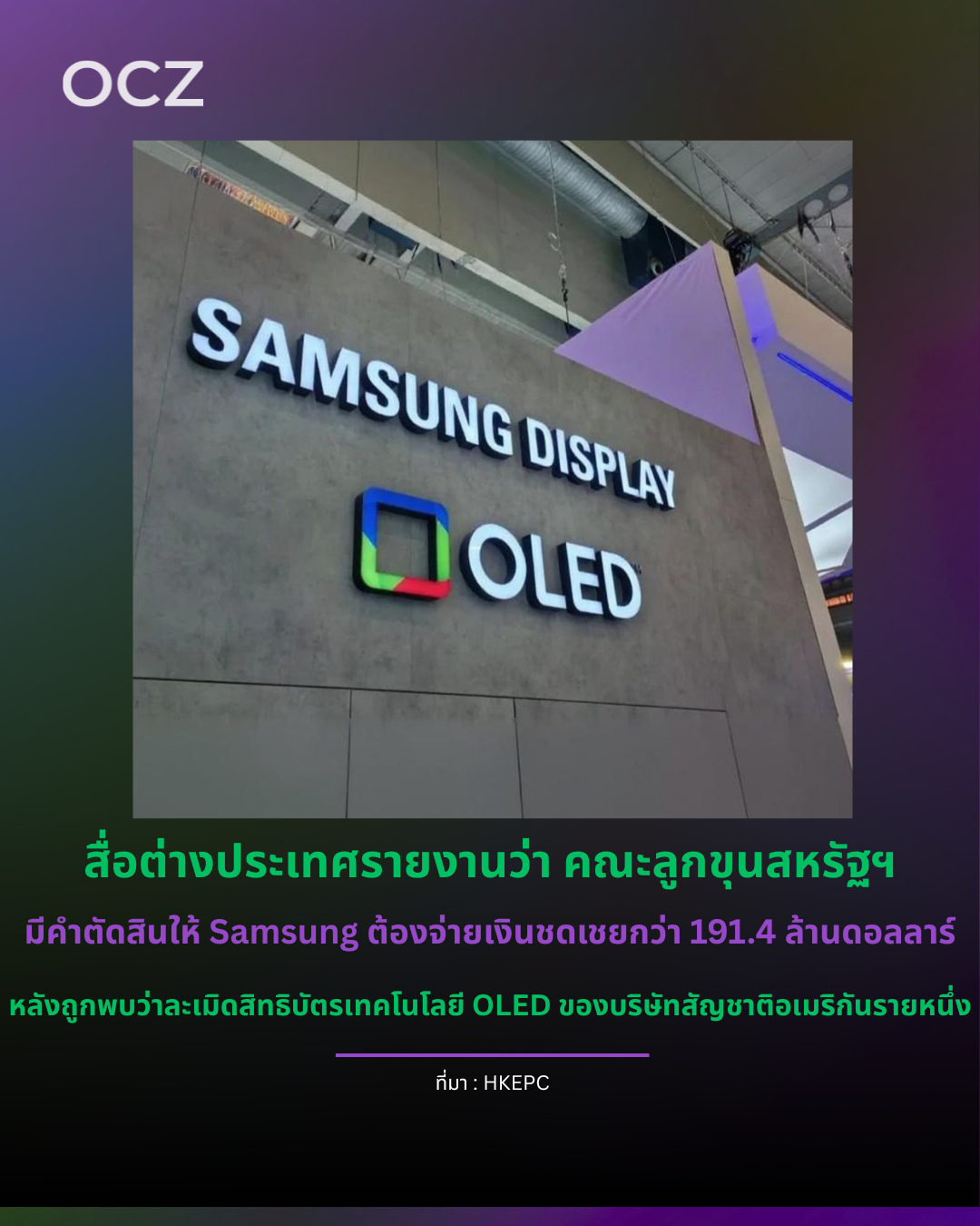 ศาลรัฐบาลกลางสหรัฐมีคำตัดสินว่า Samsung ละเมิดสิทธิบัตรเทคโนโลยี OLED ที่เป็นของบริษัท Pictiva Displays ซึ่งครอบคลุมเทคโนโลยีที่ใช้ในสมาร์ตโฟน โทรทัศน์ และอุปกรณ์สวมใส่หลายรุ่นของ Samsung โดยศาลมีคำสั่งให้ชดใช้ค่าเสียหายเป็นเงิน 191.4 ล้านดอลลาร์สหรัฐ (ประมาณ 7,000 ล้านบาท) ทั้งนี้ Samsung ยืนยันว่าจะยื่นอุทธรณ์ต่อ