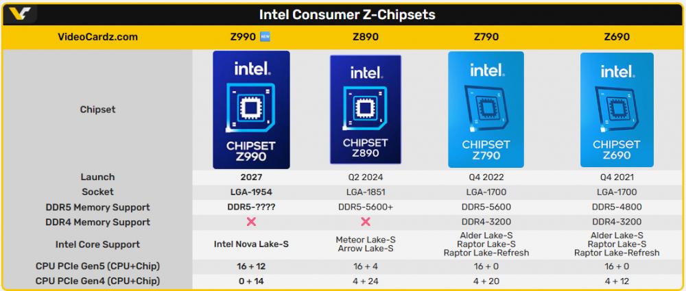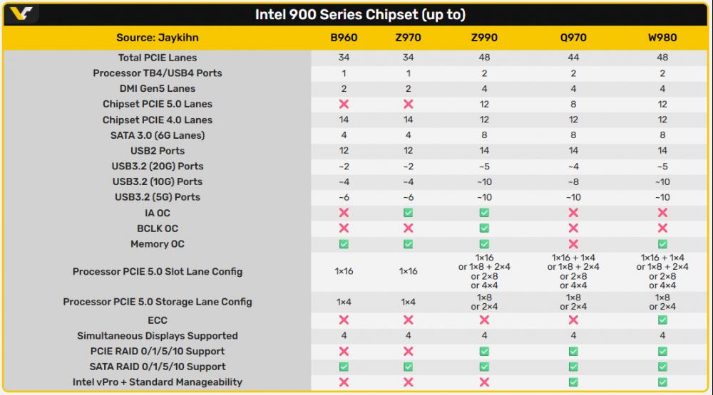 รายชื่อชิปเซ็ตที่ปรากฏในตารางประกอบด้วย B960, Z970, Z990, Q970 และ W980 ซึ่งสอดคล้องกับรายงานของ VideoCardz ก่อนหน้านี้ ที่ระบุว่า Z970 และ Z990 อยู่บนโรดแมปของ Intel จริง