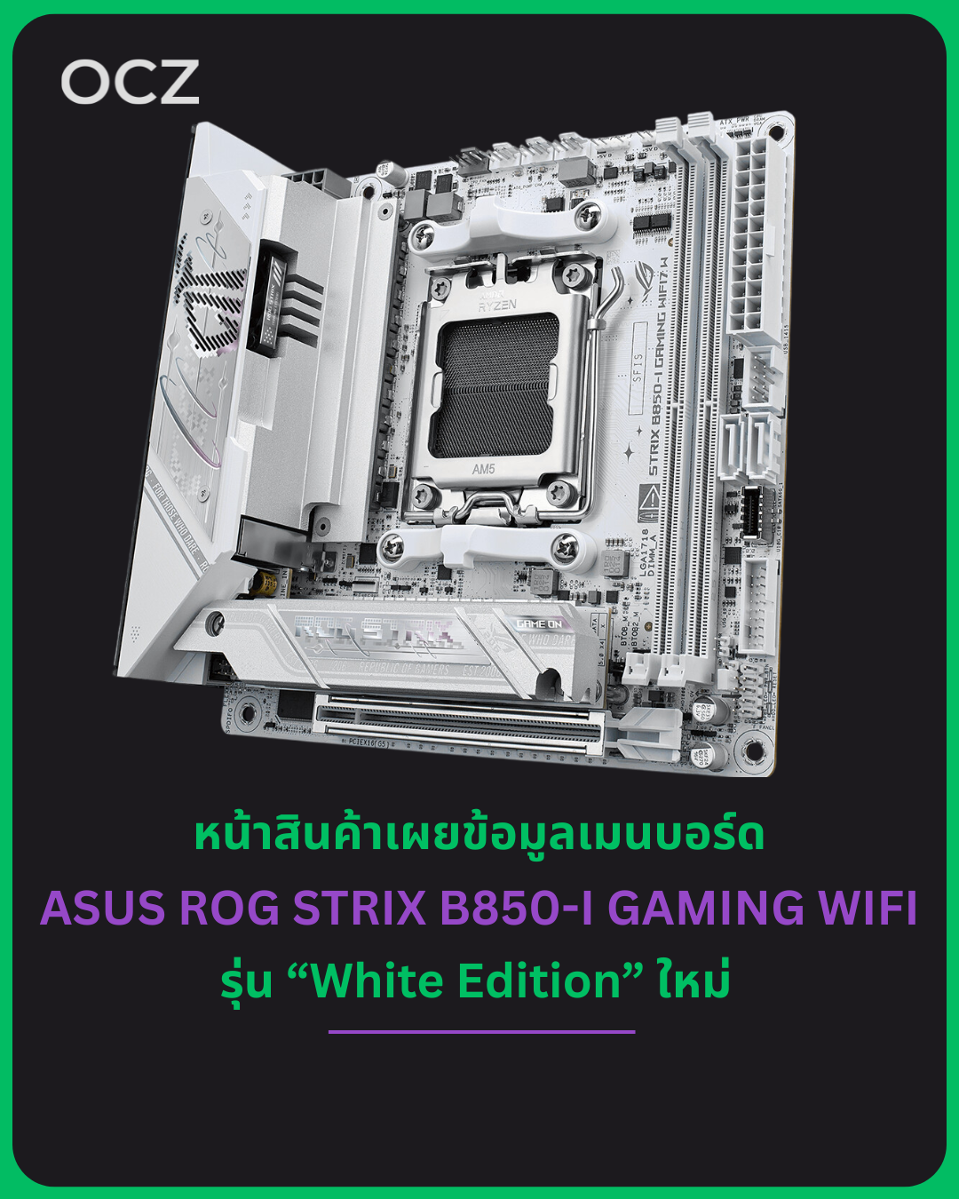 เมื่อเดือนที่แล้ว ASUS เปิดแคมเปญทีเซอร์ใบ้ถึงเมนบอร์ด ROG รุ่น Mini ตัวใหม่ โดยภาพโปรโมตเป็นรูปแบบ Mini-ITX โทนสีอ่อนที่ถูกทำให้เป็นพิกเซลจนดูไม่ชัด กระทั่งเมื่อต้นสัปดาห์ที่ผ่านมา มีภาพเรนเดอร์ชุดแรกหลุดออกมา—ความคมชัดเพียงพอที่จะยืนยันได้ว่านี่คือรุ่น สีขาว ของเมนบอร์ด Strix B850-I Gaming WiFi7 ที่เปิดตัวไปก่อนหน้า