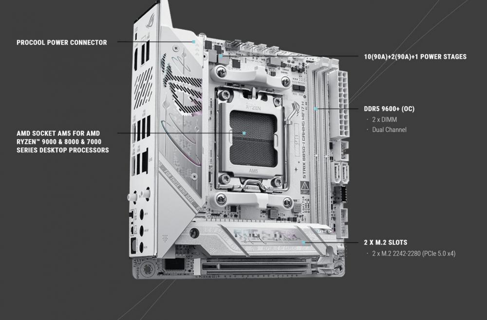 ไม่น่าแปลกใจที่ ASUS ใช้ คำอธิบายและสเปกเดียวกันเกือบทั้งหมด กับรุ่นสีดำที่วางขายแล้ว เช่น “เมนบอร์ดรุ่นล่าสุดของเราใช้เทคโนโลยีล้ำสมัยในฟอร์มแฟคเตอร์ Mini-ITX มาพร้อม PCIe 5.0 สำหรับการ์ดจอและสตอเรจ, แรม DDR5 แบบ dual-channel, ภาคจ่ายไฟแข็งแกร่งสำหรับงานหนักและการเล่นเกม, ระบบระบายความร้อนขั้นสูง และการเชื่อมต่อ Wi-Fi 7 ที่เร็วเป็นพิเศษ รองรับงานด้าน AI PC ที่ต้องการพลังประมวลผลและการเชื่อมต่อระดับสูง”