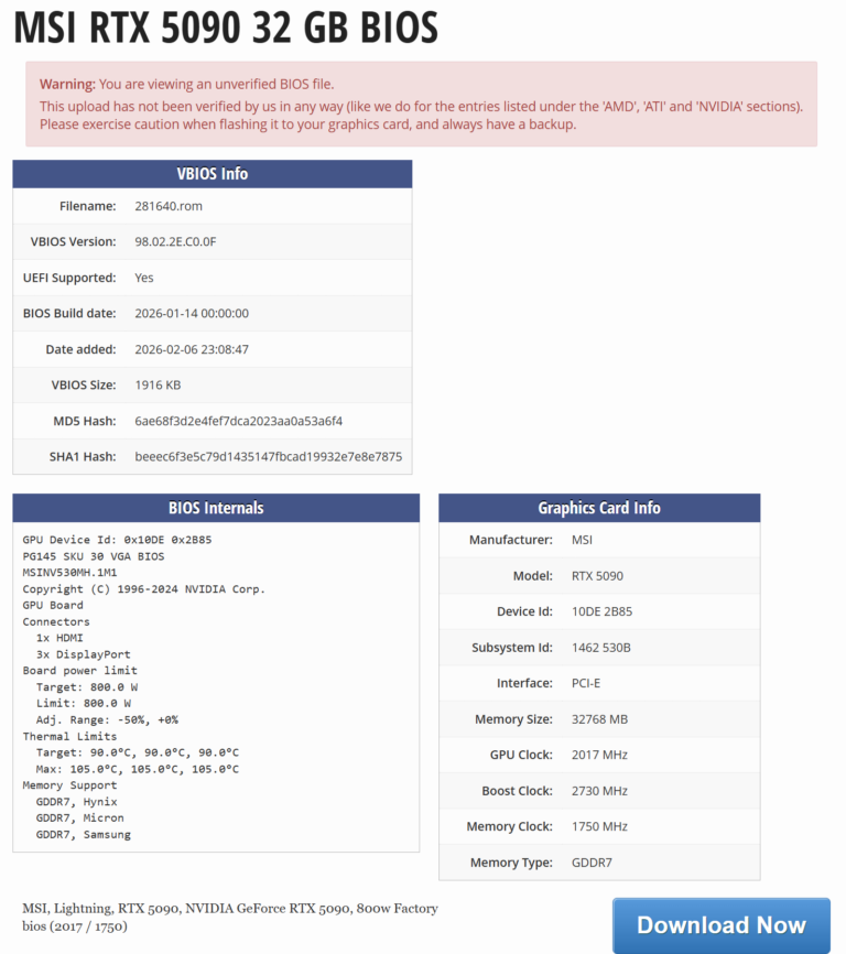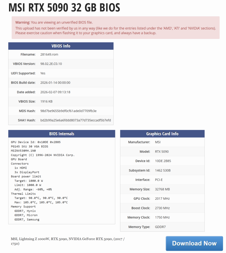 มีผู้เผยแพร่ ไฟล์ BIOS ของ MSI GeForce RTX 5090 Lightning Z ออกมา ซึ่งเป็น BIOS ที่ปลดล็อกเพดานพลังงานได้ถึง 800 วัตต์ และแม้แต่ 1000 วัตต์ โดย BIOS ชุดนี้คาดว่ามาจาก การ์ดเวอร์ชันวางขายจริง (retail) ซึ่งมีกำหนดออกสู่ตลาดในช่วงสัปดาห์หน้า