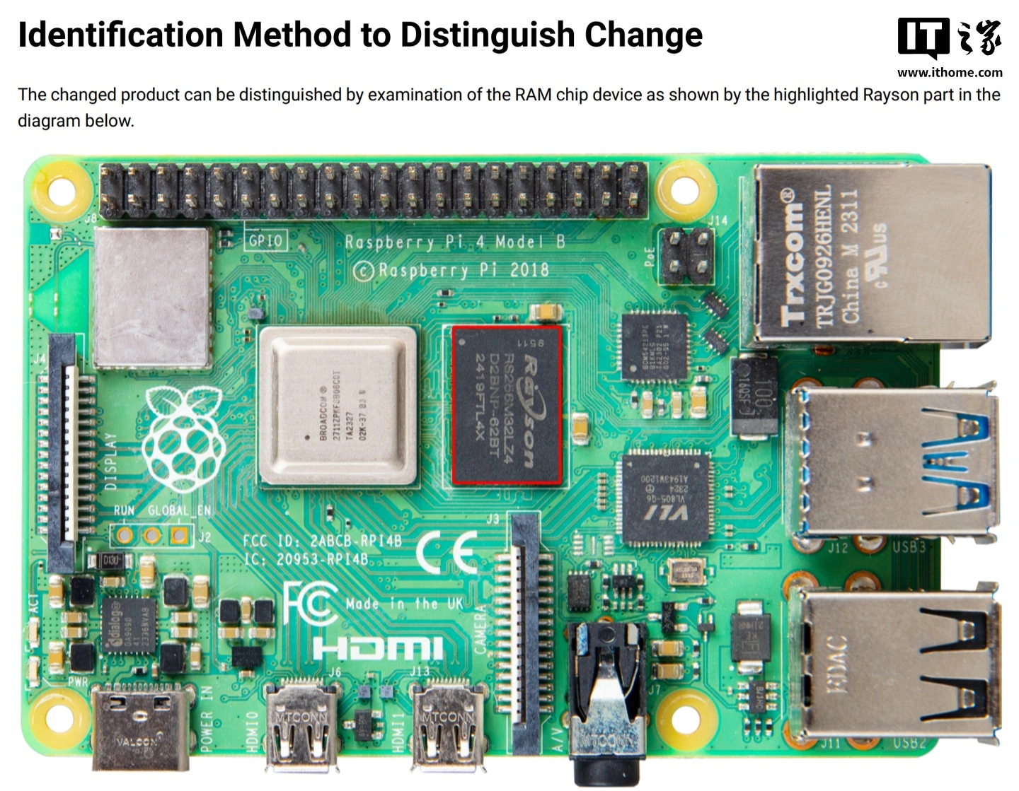 เนื่องจากชิปเดี่ยวที่ Rayson ผ่านการรับรองในปัจจุบันมีความจุสูงสุดเพียง 4GB เพื่อคงสเปกความจุ 8GB ของ Raspberry Pi 4B เอาไว้ ทาง Raspberry Pi จึงต้องปรับดีไซน์แผงวงจร (PCB) ใหม่ และเพิ่มชิป RAM ตัวที่สองไว้ด้านหลังของบอร์ด กลายเป็นโครงสร้าง หน่วยความจำแบบซ้อนสองชิป (dual-memory chip stack)