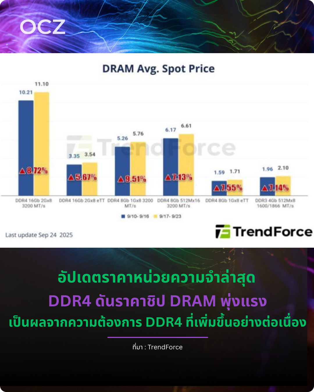 ตามรายงานล่าสุดของ TrendForce เรื่องแนวโน้มราคาสปอตหน่วยความจำ (Memory Spot Price Trend) พบว่า