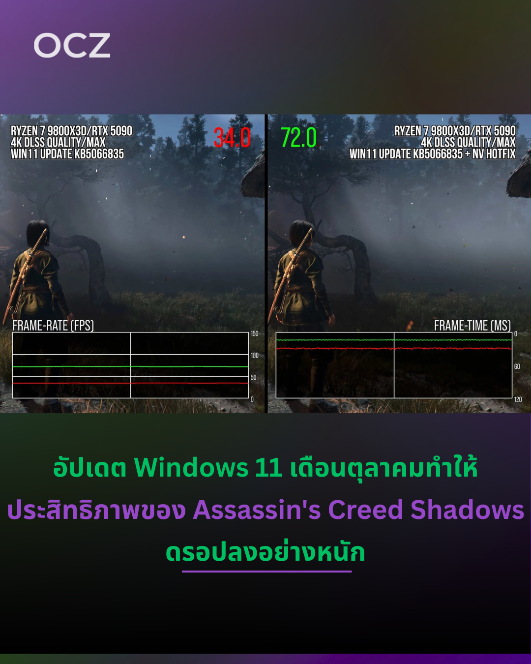 เมื่อต้นเดือนตุลาคมที่ผ่านมา ผู้เล่น Assassin’s Creed Shadows พบว่าเฟรมเรตลดลงอย่างหนักหลังติดตั้งอัปเดต Windows 11 ประจำเดือน KB5066835 แม้ NVIDIA จะออกอัปเดตไดรเวอร์เพื่อแก้ปัญหาในภายหลัง แต่ทีม Digital Foundry ได้ทำการวิเคราะห์เชิงลึกเพิ่มเติมต่อจากที่ชุมชนบน Steam พบในตอนแรก และยืนยันว่า สาเหตุมาจาก Microsoft จริง