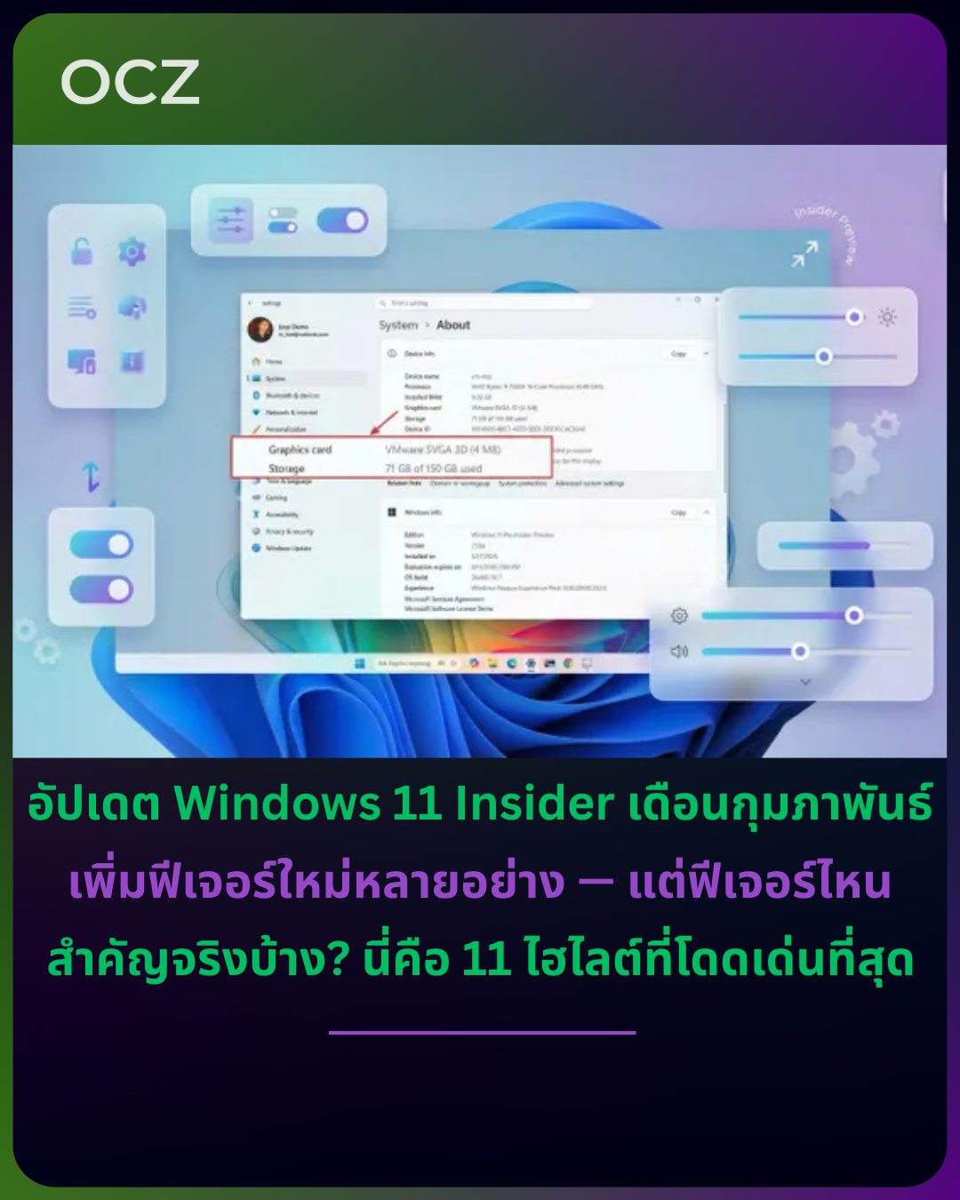 Microsoft ได้ยกเลิกการ์ดแสดงข้อมูลฮาร์ดแวร์ด้านบน (CPU, RAM, GPU และ Storage) และเพิ่มข้อมูล GPU และ Storage เข้าไปในส่วน “Device info” ซึ่งถือเป็นสิ่งที่หลายคนคาดหวังมานาน