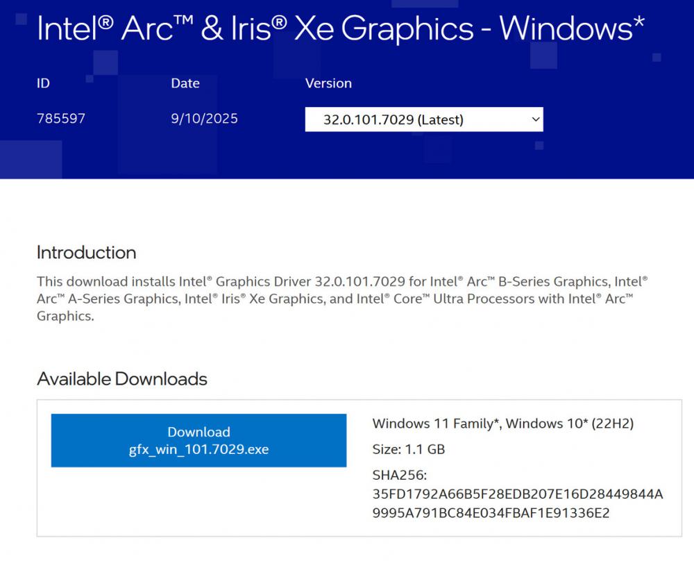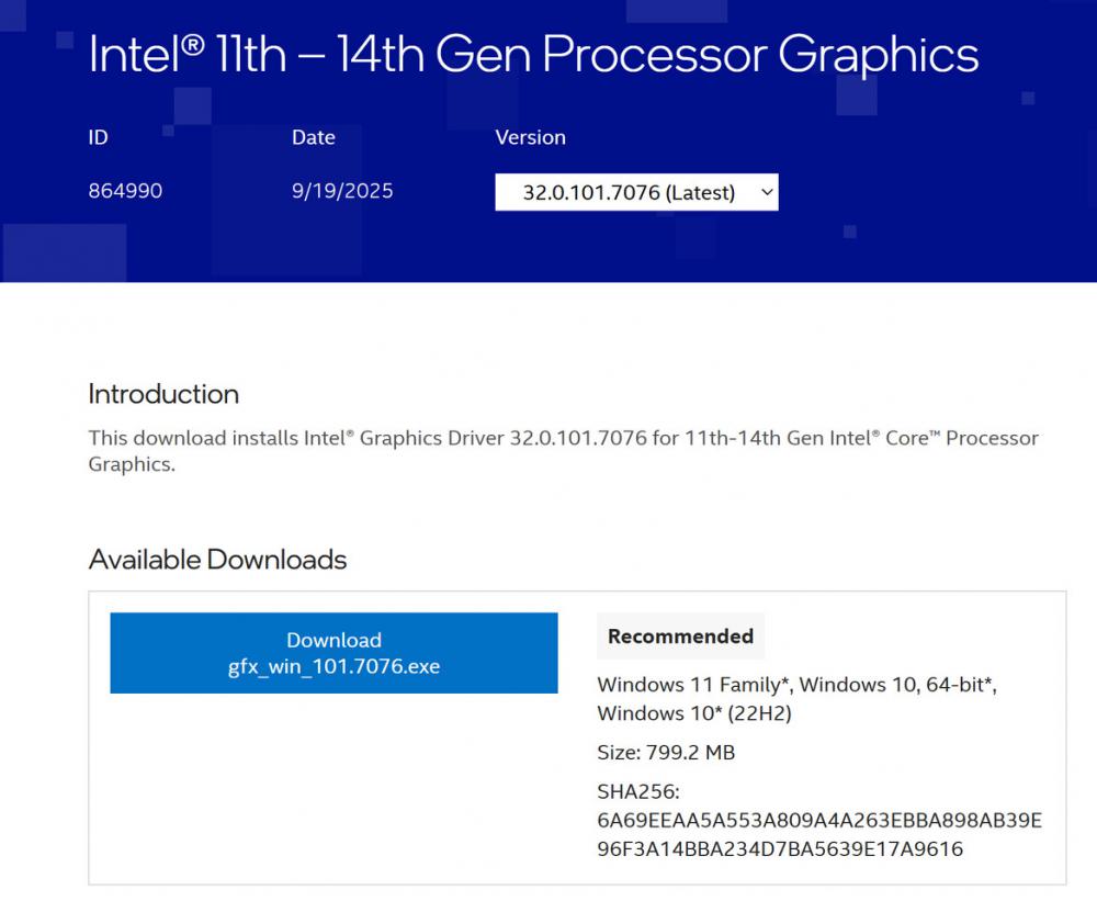 ตามข้อมูลจากไดรเวอร์ที่ออกเมื่อวันที่ 19 กันยายน อินเทลได้ปล่อย Intel Graphics Driver เวอร์ชัน 32.0.101.7076 สำหรับการ์ดจอออนบอร์ดใน Core Gen 11–14 โดยแยกการรองรับ iGPU ที่เป็น “non-Arc” (เช่น Iris/UHD รุ่นเก่า) ออกจากสาขาหลักที่รองรับ Arc + Iris Xe