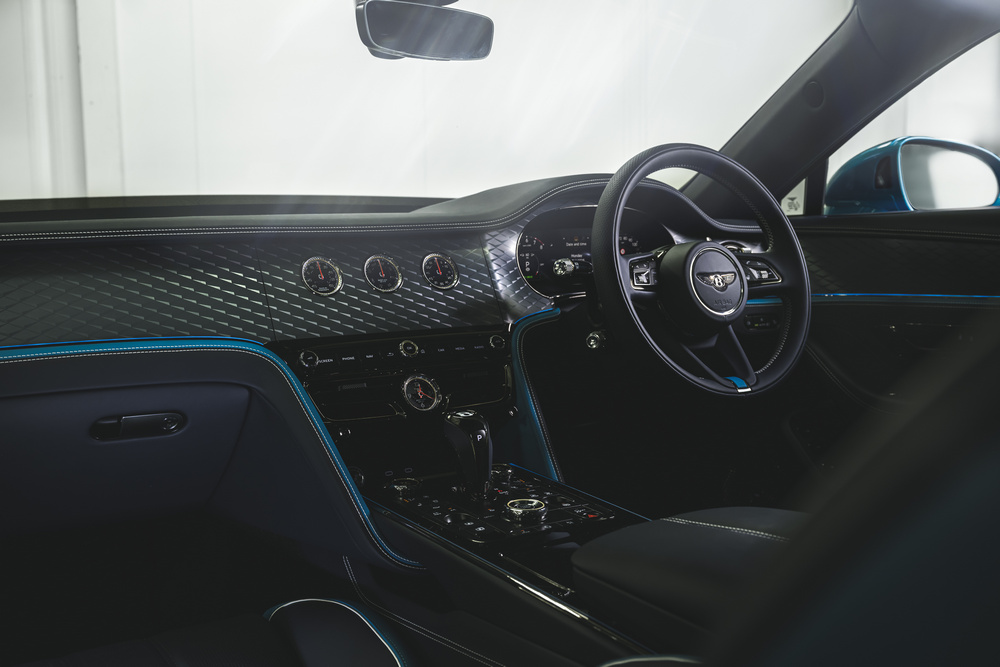 การทำสี Flying Spur ใหม่ได้ทำการไล่เฉดสีแบบแรเงาจากเฉดสีฟ้า Topaz Blue อันสดใสบริเวณส่วนหน้าสู่เฉดสีน้ำเงิน Windsor Blue ที่เข้มกว่าบริเวณส่วนหลัง โดยสีจะค่อยๆ จางลงตั้งแต่ช่วงกลางตัวถังตลอดแนวประตูห้องโดยสารและหลังคา กระบวนการนี้ใช้เวลากว่า 60 ชั่วโมงผ่านช่างเทคนิคผู้เชี่ยวชาญจำนวน 2 คนที่เริ่มต้นการพ่นสีแต่ละสีที่บริเวณส่วนหน้าและส่วนหลังของตัวถัง และเปลี่ยนเฉดสีบริเวณกึ่งกลางตัวถังด้วยกระบวนการพ่นสีอันเป็นขั้นตอนการใช้สีที่ผ่านการผสมสีแบบดั้งเดิมเพื่อให้ได้เอฟเฟกต์ Ombré ซึ่งถือเป็นเทคนิคพิเศษที่ทำให้การเปลี่ยนสีเป็นไปอย่างสมมาตรทั่วทั้งตัวรถ