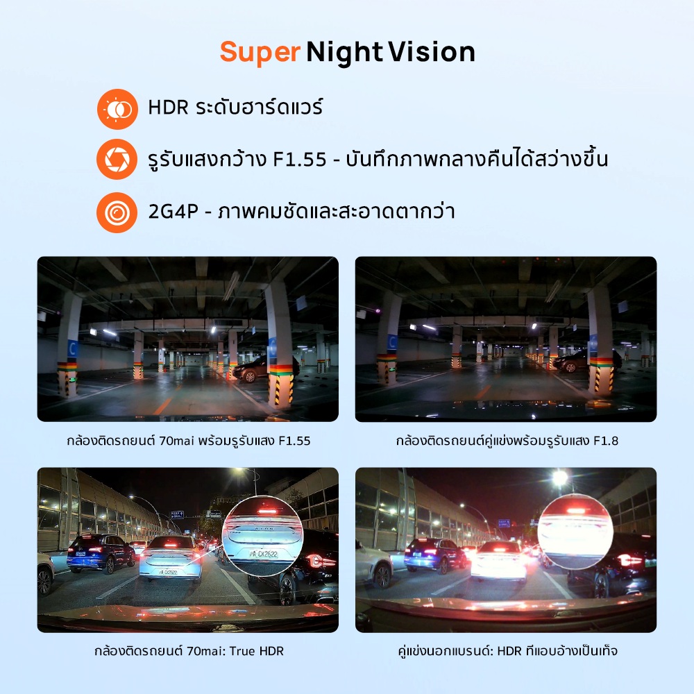 ไม่ว่าคุณจะเป็นผู้ใช้กล้องติดรถยนต์มือใหม่ หรือกำลังมองหากล้องรุ่นอัปเกรดที่เรียบง่ายและวางใจได้ กล้องติดรถยนต์ 70mai A410 คือจุดเริ่มต้นที่สมบูรณ์แบบ ด้วยความละเอียดแท้จริงระดับ 2.5K สำหรับกล้องหน้า และ 1080P สำหรับกล้องหลัง โดยกล้องติดรถยนต์ 70mai A410 สามารถบันทึกภาพได้อย่างคมชัดและละเอียดทุกมุม ไม่พลาดทุกช่วงเวลาสำคัญ ตั้งแต่ป้ายทะเบียนไปจนถึงป้ายจราจร ทั้งกลางวันและกลางคืน
