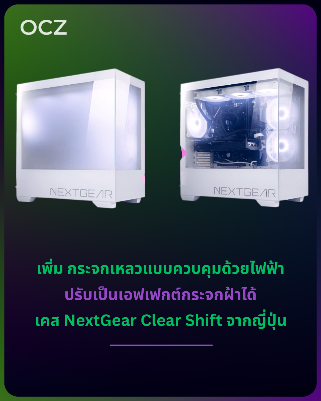 NextGear Clear Shift เป็นเคส mATX แบบโชว์วิวเต็มตา จุดขายหลักคือเทคโนโลยีกระจกเหลว โดยใช้หลักการเคลือบฟิล์มนำไฟฟ้าใส อินเดียมทินออกไซด์ (ITO) บนผิวกระจก