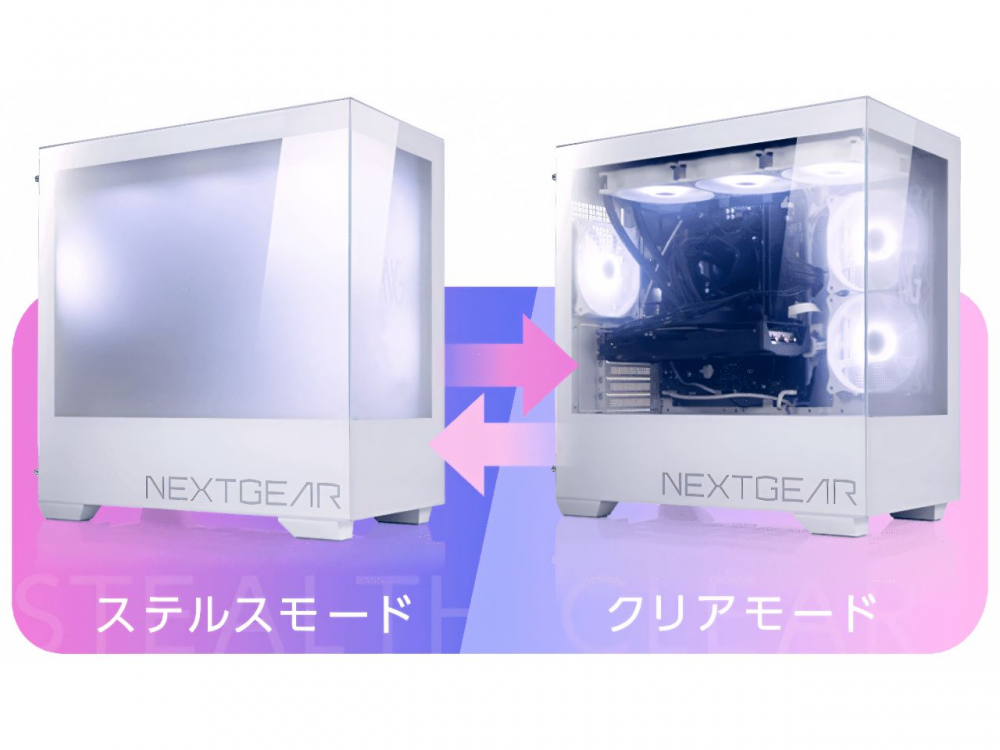 ในโหมด ステルスモード (ซ่อน) แม้มองไม่เห็นฮาร์ดแวร์ด้านใน แต่ไฟ ARGB ยังส่องสวยงาม ส่วนเวลาจะโชว์ของต่อหน้าเพื่อน แค่กดปุ่มเดียว โหมด クリアモード (ใส) ก็เปลี่ยนจากฝ้าเป็นใสทันที—เท่แบบสายโชว์ของสุด ๆ