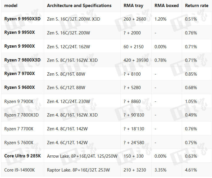 เมื่อขยายมุมมองไปยังไลน์ผลิตภัณฑ์ของ AMD ทั้งหมด จะเห็นว่าอัตรา RMA ของ Ryzen 7 9800X3D ใกล้เคียงกับรุ่นอื่น ๆ ในตระกูลเดียวกัน โดยข้อมูลระบุว่า Ryzen 9 9950X3D มีความเสถียรดีที่สุด ด้วยอัตราการคืนเพียง 0.51% ขณะที่ Ryzen 7 9700X มีอัตราการคืนสูงกว่าเล็กน้อย อยู่ที่ประมาณ 0.85%