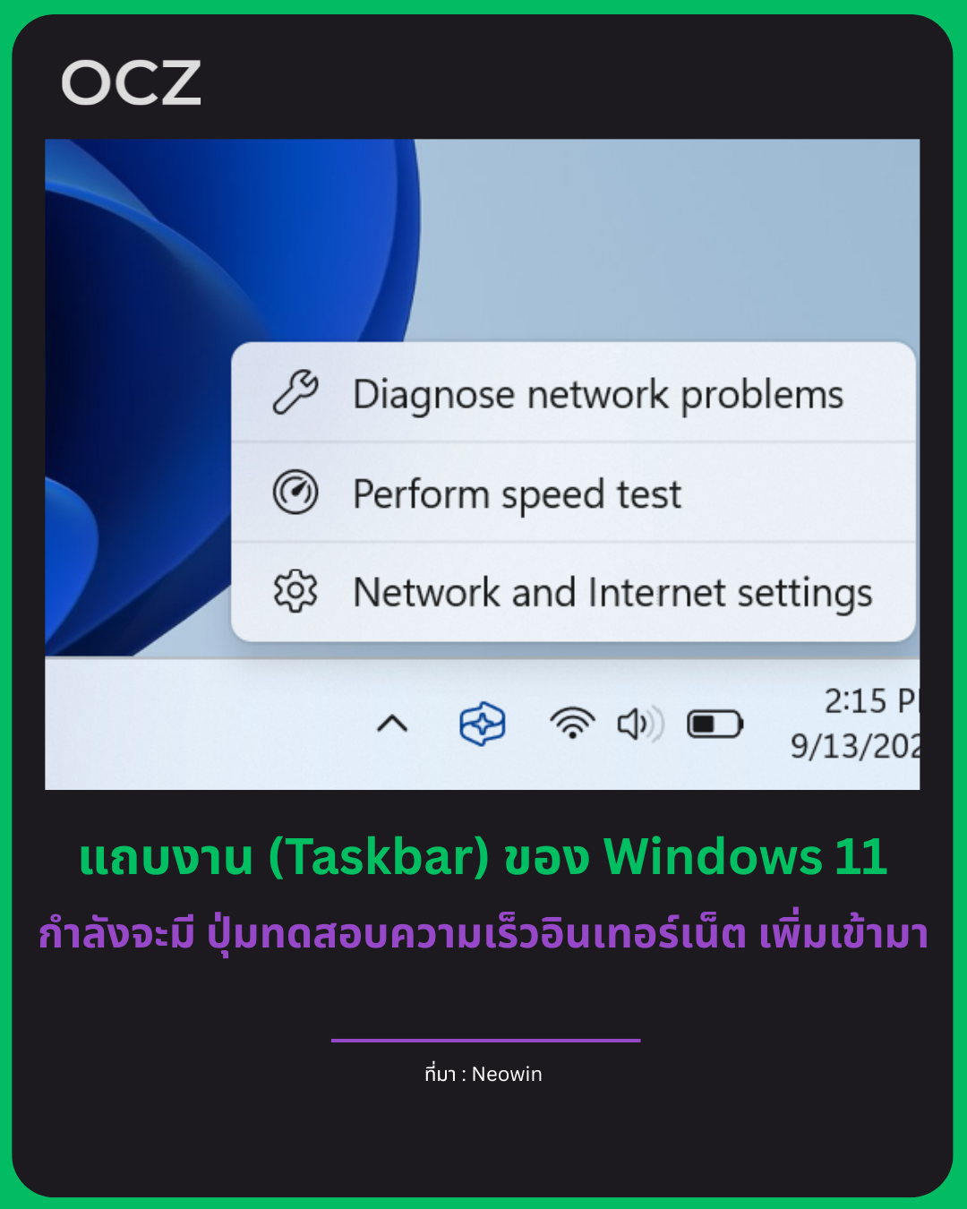 Windows 11 รุ่นทดสอบล่าสุด ในช่อง Dev และ Beta มีฟีเจอร์ใหม่ที่ถูกซ่อนอยู่หลายอย่าง ซึ่ง Microsoft กำลังเตรียมปล่อยให้ใช้งานในอนาคต — หนึ่งในนั้นก็คือ ปุ่มทดสอบความเร็วอินเทอร์เน็ตแบบในตัว (ประมาณนั้น) ที่อยู่ใน เมนูเครือข่าย (network flyout) บนแถบงาน