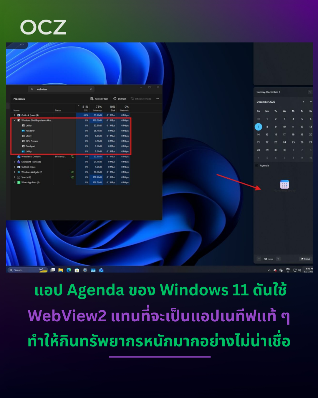 ยิ่งไปกว่านั้น Agenda ยังเรียกใช้ GPU Process, Renderer และองค์ประกอบมาตรฐานของ WebView2 อื่น ๆ เนื่องจากต้องวาด UI และเรนเดอร์มุมมอง Agenda ทำให้ตอนโหลดต้องใช้ CPU อยู่ที่ประมาณ 6–20%