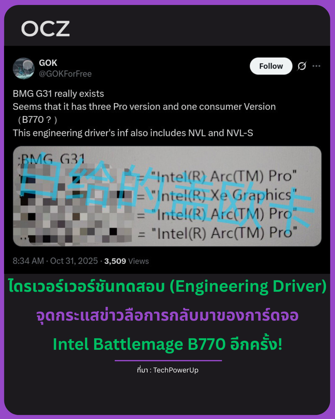 แม้ตอนนี้จะยังไม่ชัดเจนว่า การกล่าวถึงชื่อ B770 ในไดรเวอร์นั้น หมายถึงการที่ Intel “กำลังจะเปิดตัวจริง” หรือเพียงแค่ “โค้ดที่ใส่ไว้ตั้งแต่ช่วงต้นการพัฒนา” แต่สิ่งหนึ่งที่แน่นอนคือ — มันเป็นสัญญาณชัดเจนว่า Intel Arc B770 ยังมีการเคลื่อนไหวอยู่เบื้องหลัง และอาจยังไม่ถูกยกเลิกอย่างที่หลายคนคิด