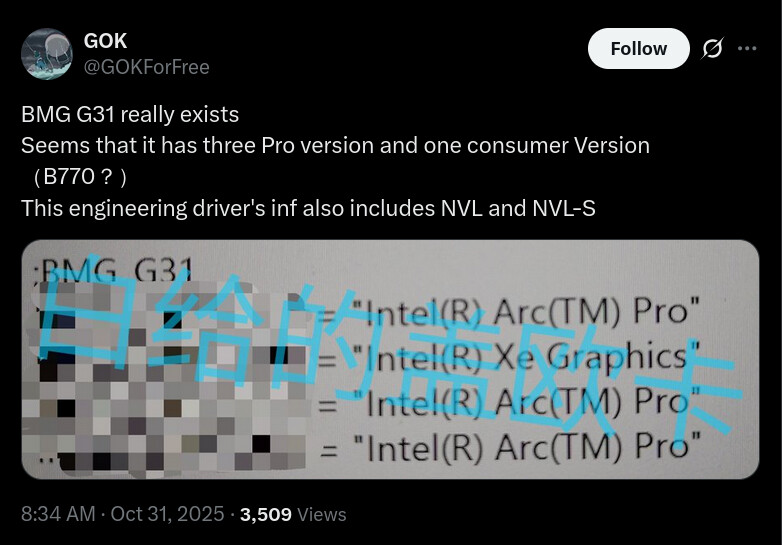 และตอนนี้หลักฐานใหม่ที่ทำให้ข่าวลือดังกล่าวดูมีน้ำหนักมากขึ้นก็คือ — มีคนค้นพบข้อมูลใน ไดรเวอร์กราฟิกเวอร์ชันทดสอบของ Intel (Engineering Driver) ซึ่งถูกแชร์โดยผู้ใช้ X (Twitter) ชื่อ @GOKForFree โดยภายในไฟล์นั้นมีการกล่าวถึงชิป BMG-G31 GPU die ซึ่งเป็นซิลิคอนที่เกี่ยวข้องกับ Intel Arc B770 รุ่นเรือธง และยังพบการอ้างอิงถึงการปรับแต่ง (configuration) ของ Xe2 die ทั้งหมด 4 แบบ