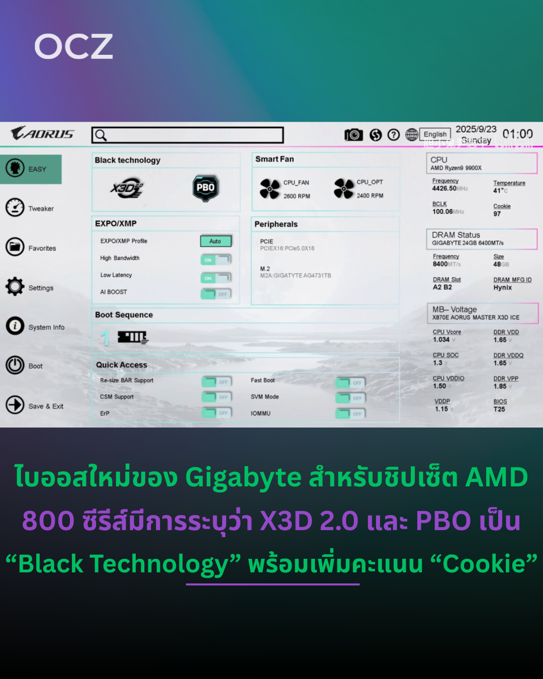 ดูเหมือนว่าโอเวอร์คล๊อกเกอร์ในสังกัดของ GIGABYTE อย่าง Hicookie จะมีส่วนร่วมในการออกแบบ BIOS ใหม่นี้ด้วย เนื่องจากพบว่ามีฟีเจอร์ “Cookie score” อยู่ในอินเทอร์เฟซด้วย ซึ่งเป็นตัวบ่งชี้คุณภาพ CPU แบบ AI ที่ Hicookie พัฒนาขึ้น เดิมเคยถูกเรียกว่า “Bisquits A.I” บนเมนบอร์ดรุ่นก่อน ๆ ขณะเดียวกัน ฟีเจอร์ปรับแต่ง CPU บางรายการอย่าง “X3D 2.0” และ PBO ถูกจัดกลุ่มอยู่ภายใต้หมวด “Black Technology” ในเมนู