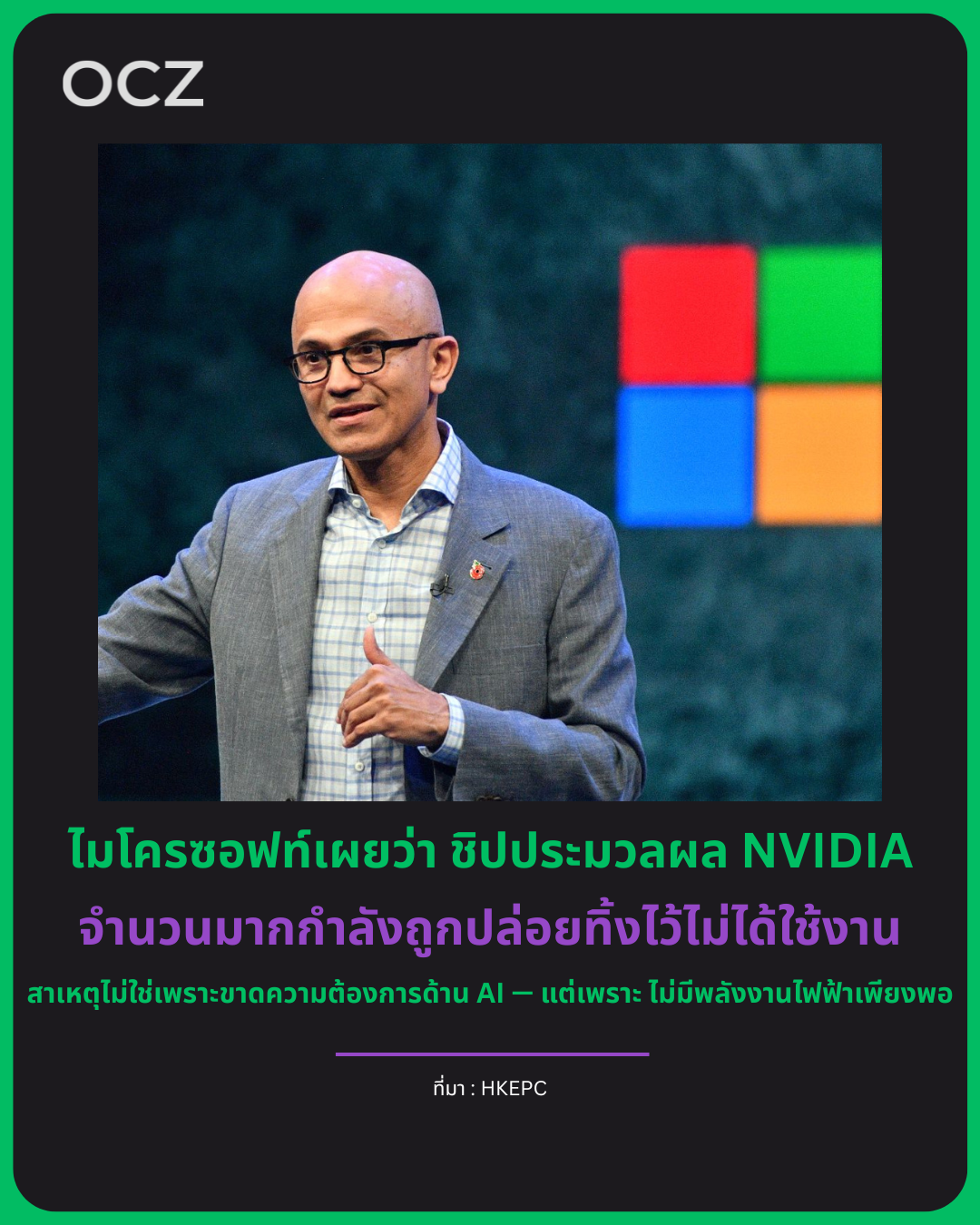 ตามรายงานของ Wccftech Nadella กล่าวในรายการ BG2 Podcast ว่า ขณะนี้อุตสาหกรรม AI กำลังเผชิญปัญหา ขาดแคลนพลังงานไฟฟ้า ทำให้มี GPU จำนวนมากถูกเก็บไว้โดยไม่ได้ใช้งาน เพราะ “ไม่มีพลังงานเพียงพอ” สำหรับเปิดใช้งานศูนย์ข้อมูลเพิ่มเติม
