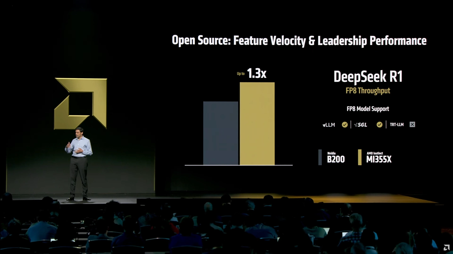 AMD อ้างว่า Instinct MI355X มี ประสิทธิภาพ FP8 throughput สูงกว่า NVIDIA Blackwell B200 ถึง 30% ในการทดสอบ benchmark บน DeepSeek R1