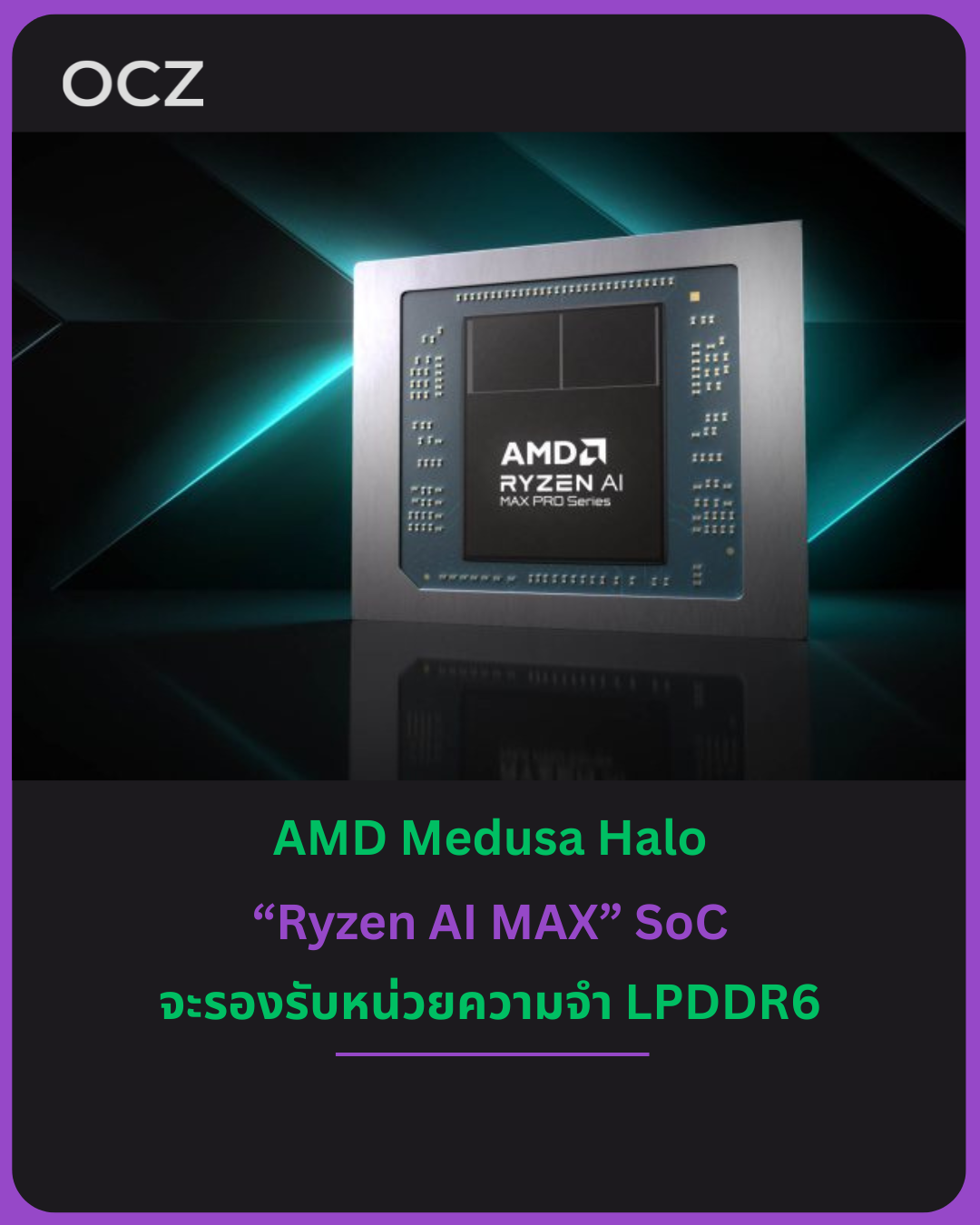 SoC ตระกูล Ryzen AI MAX รุ่นใหม่ของ AMD ที่ใช้โค้ดเนม Medusa Halo จะมาพร้อมการรองรับหน่วยความจำ LPDDR6 ซึ่งช่วยยกระดับแบนด์วิดท์ของระบบอย่างมีนัยสำคัญ