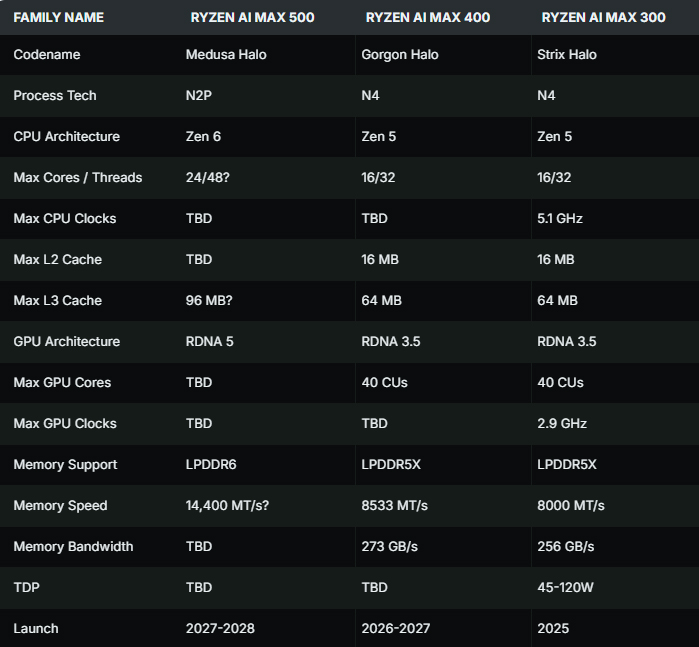 แม้ตอนนี้จะยังเร็วเกินไปที่จะสรุปสเปกที่แน่นอนของ Medusa Halo แต่มีความเป็นไปได้ว่าจะมาพร้อม คอร์ CPU สูงสุดถึง 24 คอร์ และ GPU ที่มีจำนวนคอร์ใกล้เคียงหรือแรงกว่าเดิม ที่สำคัญคือแพลตฟอร์มจะก้าวไปใช้มาตรฐานหน่วยความจำยุคใหม่อย่าง LPDDR6