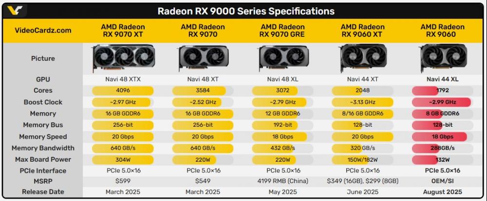 RX 9060 ใช้ชิป Navi 44 แบบถูกตัดสเปก เหลือ 1,792 คอร์ มาพร้อมแรม 8GB GDDR6 18Gbps บัส 128-bit แบนด์วิธ 288 GB/s และค่า TBP อยู่ที่ 132W