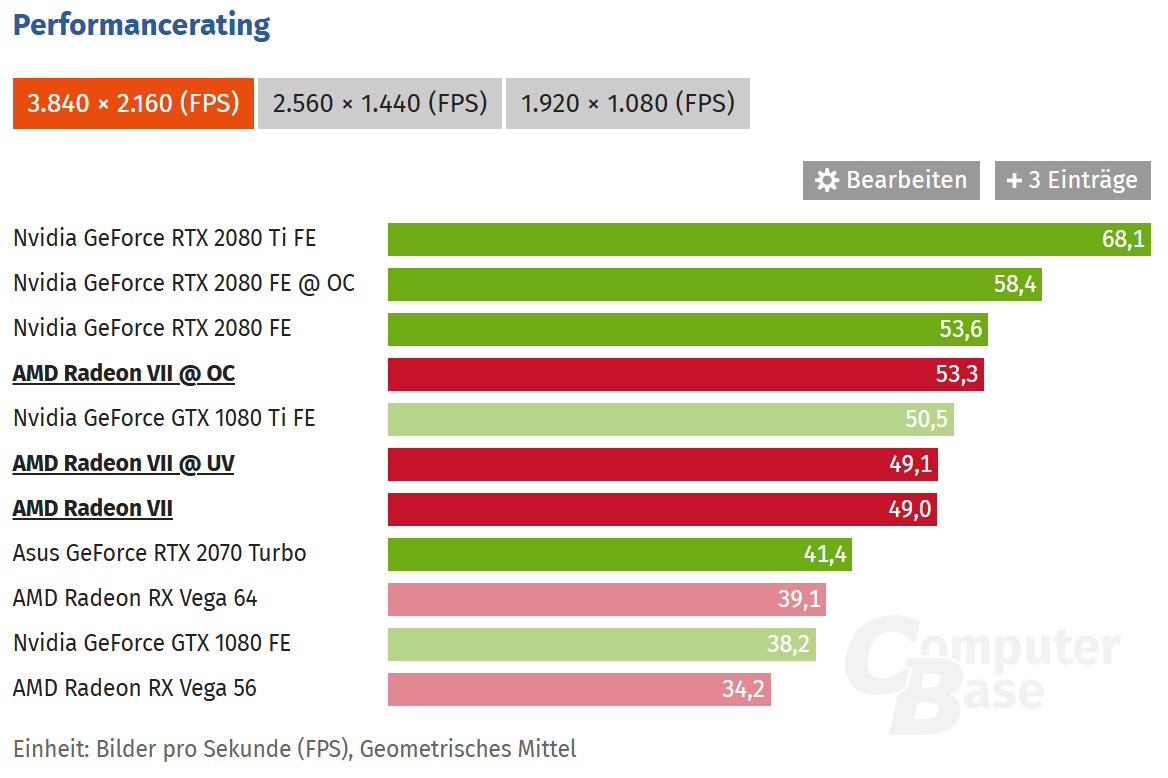 บทความย้อนหลังฉลองครบรอบ 7 ปี จากสื่อเยอรมัน ComputerBase ได้อัปเดตตารางประสิทธิภาพใหม่ ซึ่งสะท้อนตำแหน่งของ Radeon VII ในปัจจุบันได้ชัดเจน