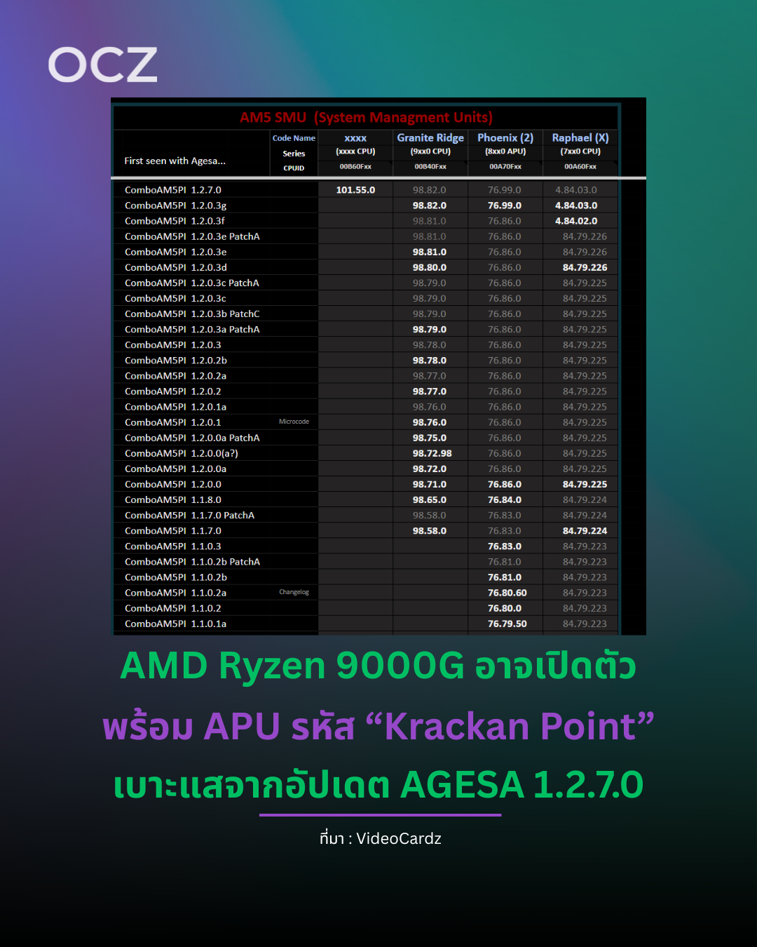 ในชุมชนผู้ติดตาม AGESA ยังได้รวบรวมข้อมูลจากตาราง SMU/MC บนแพลตฟอร์ม AM5 และพบว่า Krackan และ Krackan 2 ปรากฏเฉพาะในข้อมูลระดับ BIOS เท่านั้น นั่นหมายความว่า แม้ AGESA จะรองรับซีพียูเหล่านี้แล้ว “หลักฐานยืนยันจริง” ก็ยังคงต้องอาศัยการขุดข้อมูลจาก BIOS ต่อไป และอาจต้องใช้เวลาอีกสักพักกว่าที่เราจะได้เห็นตัวชิปออกมาจริง